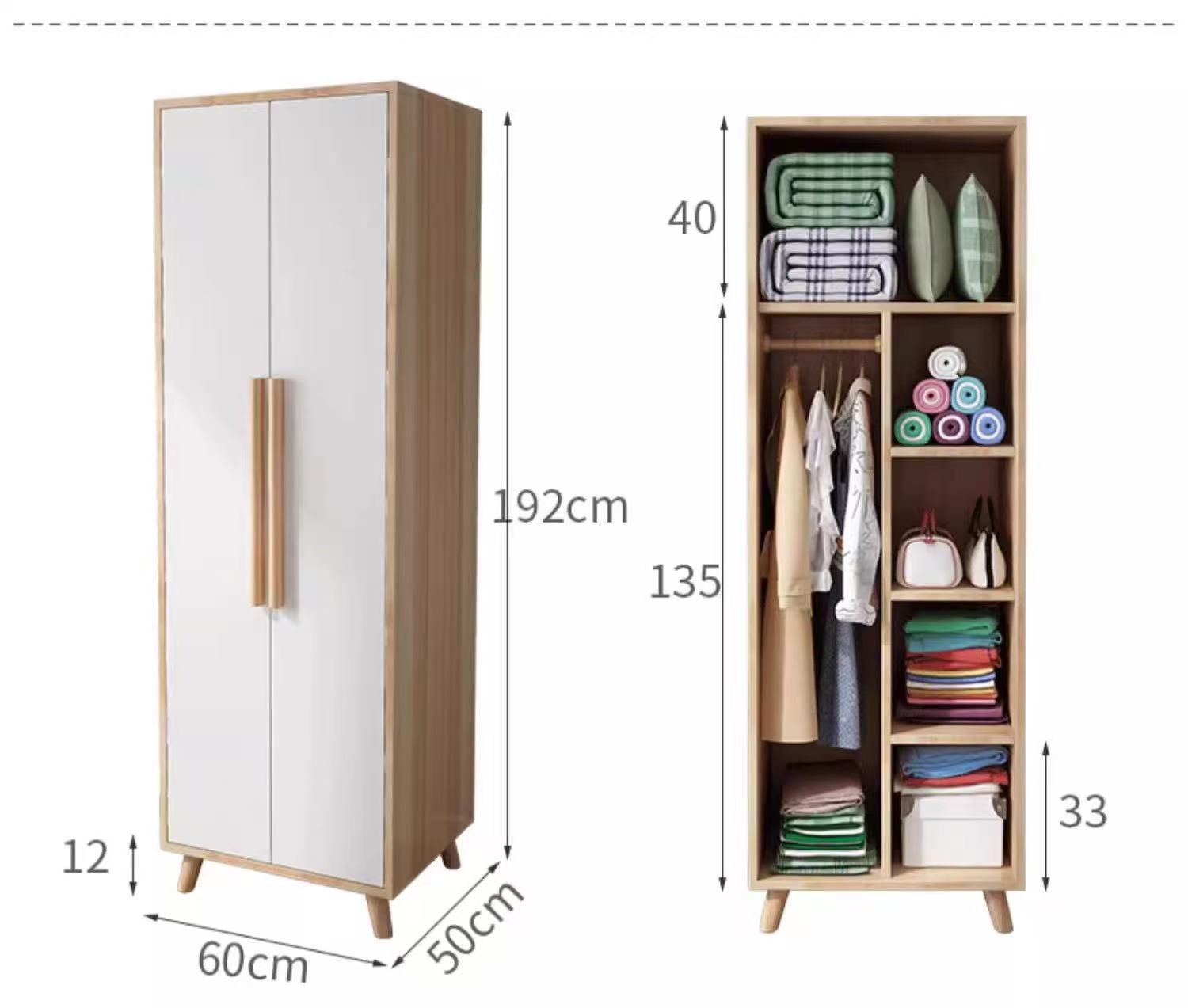 אחסון חכם ומסודר – כולל מדפים בצד אחד ותליה ארוכה בצד השני לבגדים, תיקים ונעליים.