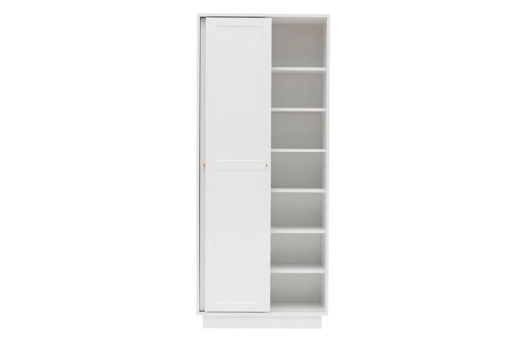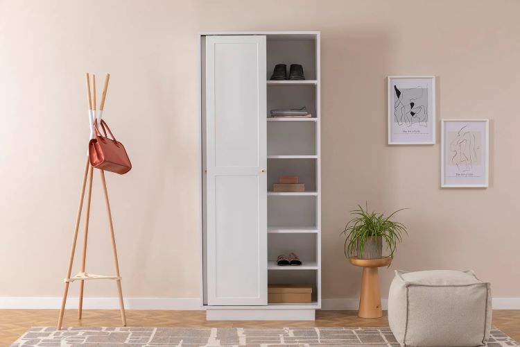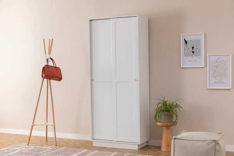 ארון בגדים מעוצב בגוון לבן, עם דלתות הזזה לנוחות שימוש וחיסכון במקום.