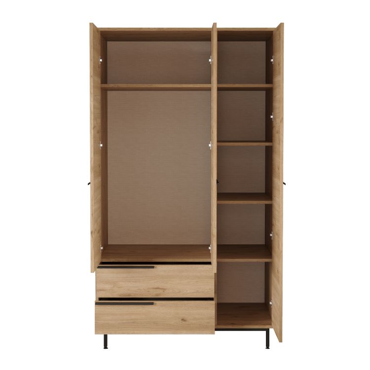 ארון בגדים 3 דלתות עם 2 מגירות דגם Gaash מבית Twins Design – ארון מעוצב בגימור עץ אלגנטי עם פונקציונליות חכמה. בצד ימין אזור תלייה מרווח עם מדף עליון אפור, בצד שמאל דלת עם 5 מדפים פנימיים לארגון נוח של סוודרים, מצעים ותיקים, ובתחתית 2 מגירות עמוקות לתחתונים ואביזרים. עיצוב מינימליסטי שמשתלב בכל חדר שינה בשילוב חומרים איכותיים לשימוש יומיומי לאורך שנים.