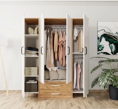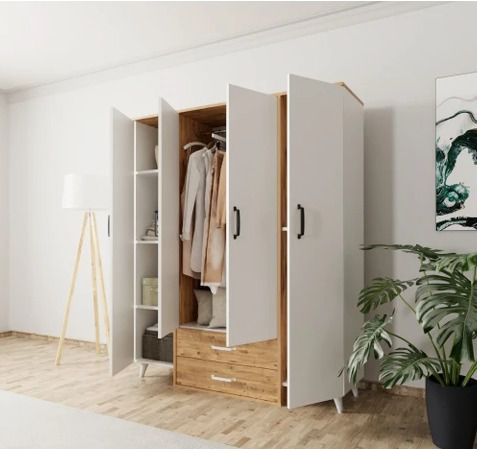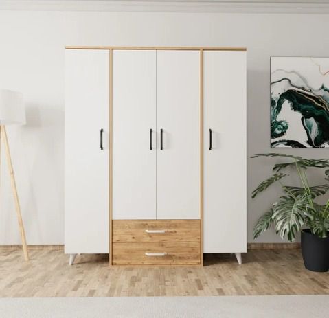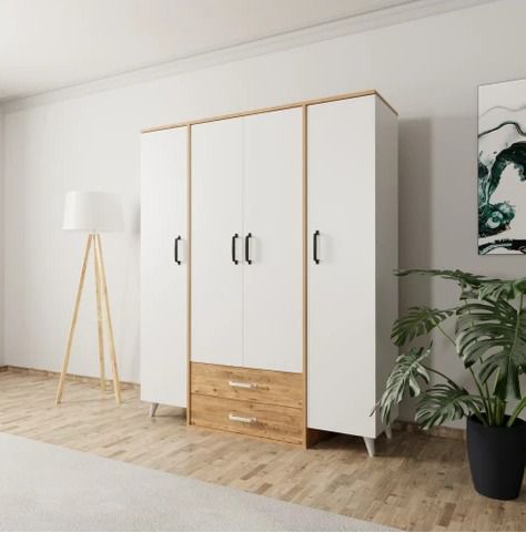 ארון בגדים 4 דלתות עם 2 מגירות – שילוב לבן ועץ