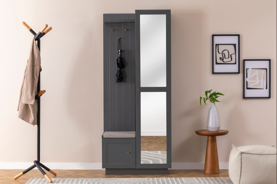 ✔ פתרון כולל: מראה + ספסל + אחסון ותלייה