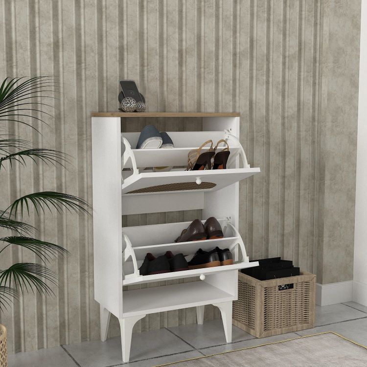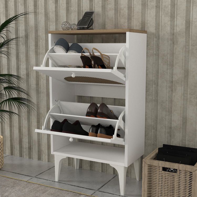 הארון עשוי סיבית בציפוי מלמין עמיד וקל לניקוי, בגוון לבן נקי עם משטח עליון בגימור עץ טבעי – מה שהופך אותו גם לאידיאלי להנחת פריטים דקורטיביים בכניסה לבית.