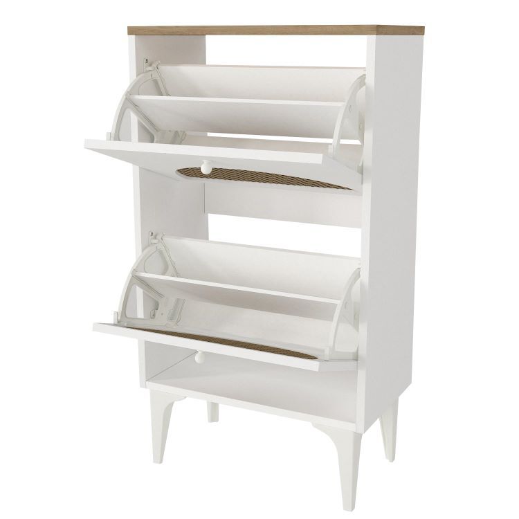 הארון כולל 3 תאי אחסון נפתחים עם מנגנון פתיחה קל ונוח, המתאימים לאחסון של כ-9 זוגות נעליים. כל תא נפתח קדימה ומציג מתקן פנימי שמחזיק את הנעליים בצורה מסודרת ונגישה. החזיתות מעוצבות בשילוב רצועות ראטן חומות טבעיות בגימור חצי עגול – מה שמוסיף טאץ’ חמים וביתי לרהיט מודרני.