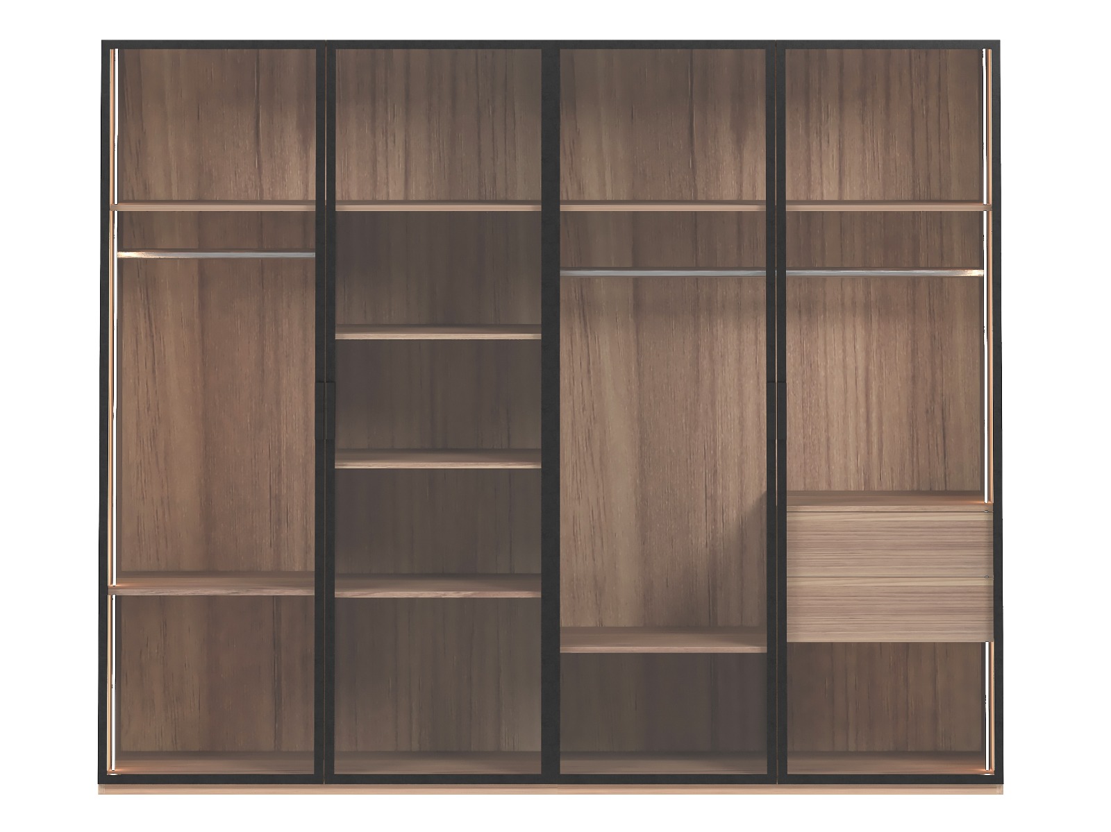 ארון פתוח המכיל מדפים רבים ומתלים לתליית בגדים