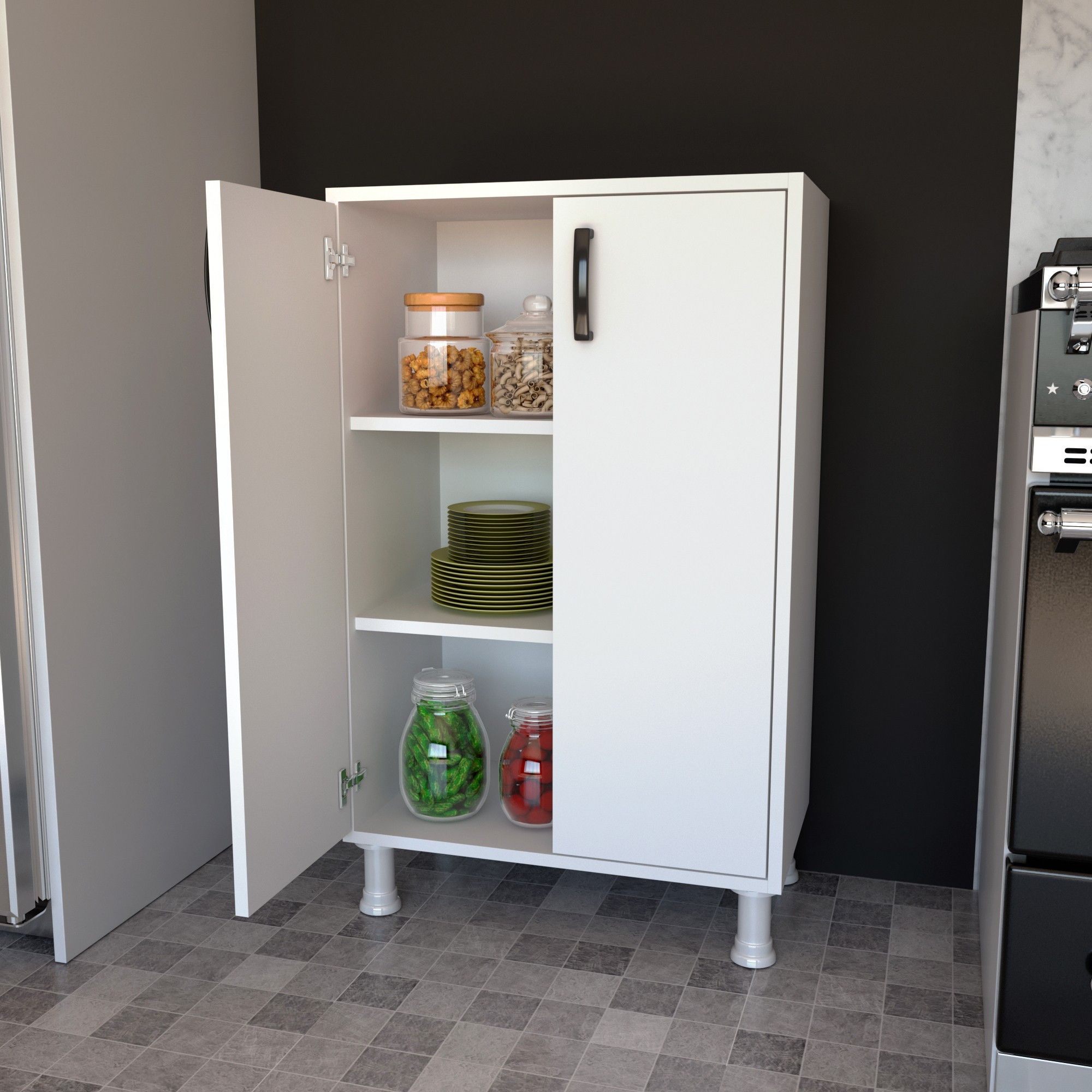 ארון אחסון מודרני ונוח, המאפשר ארגון חכם של כלי מטבח, מוצרי מזון וחפצים נוספים.