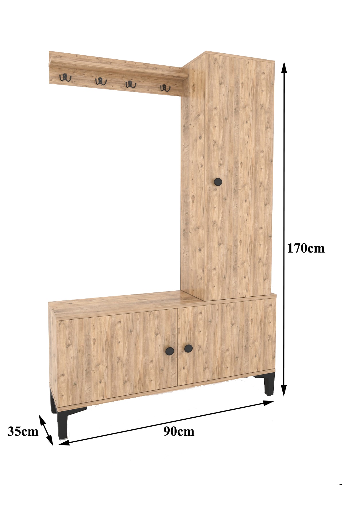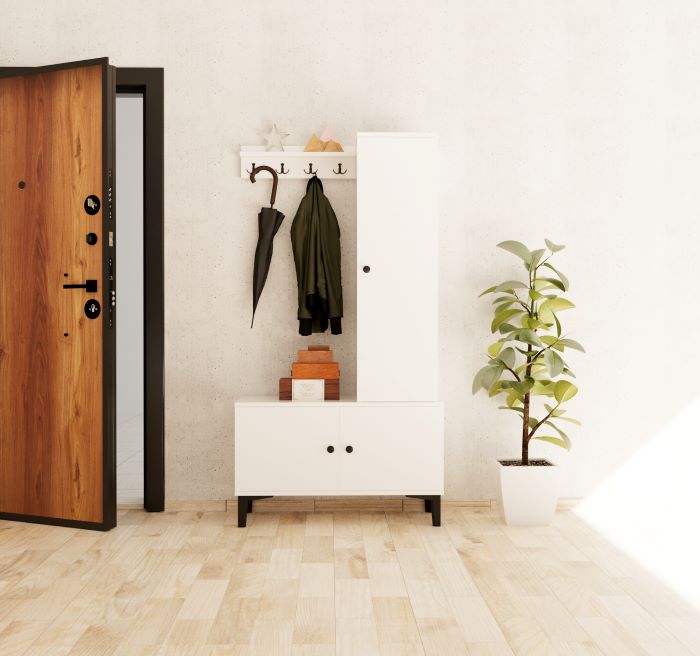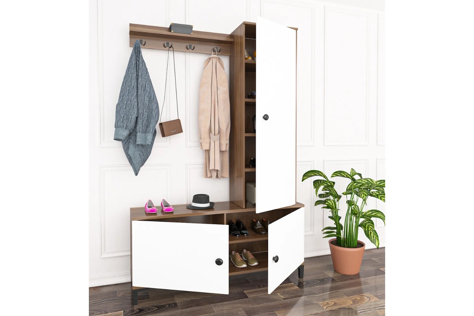 ארון שירות מעוצב, פרקטי ושימושי, כולל מגוון מדפים לאחסון וווים לתליית מעילים, צעיפים וכובעים.