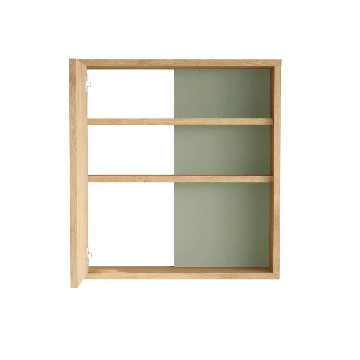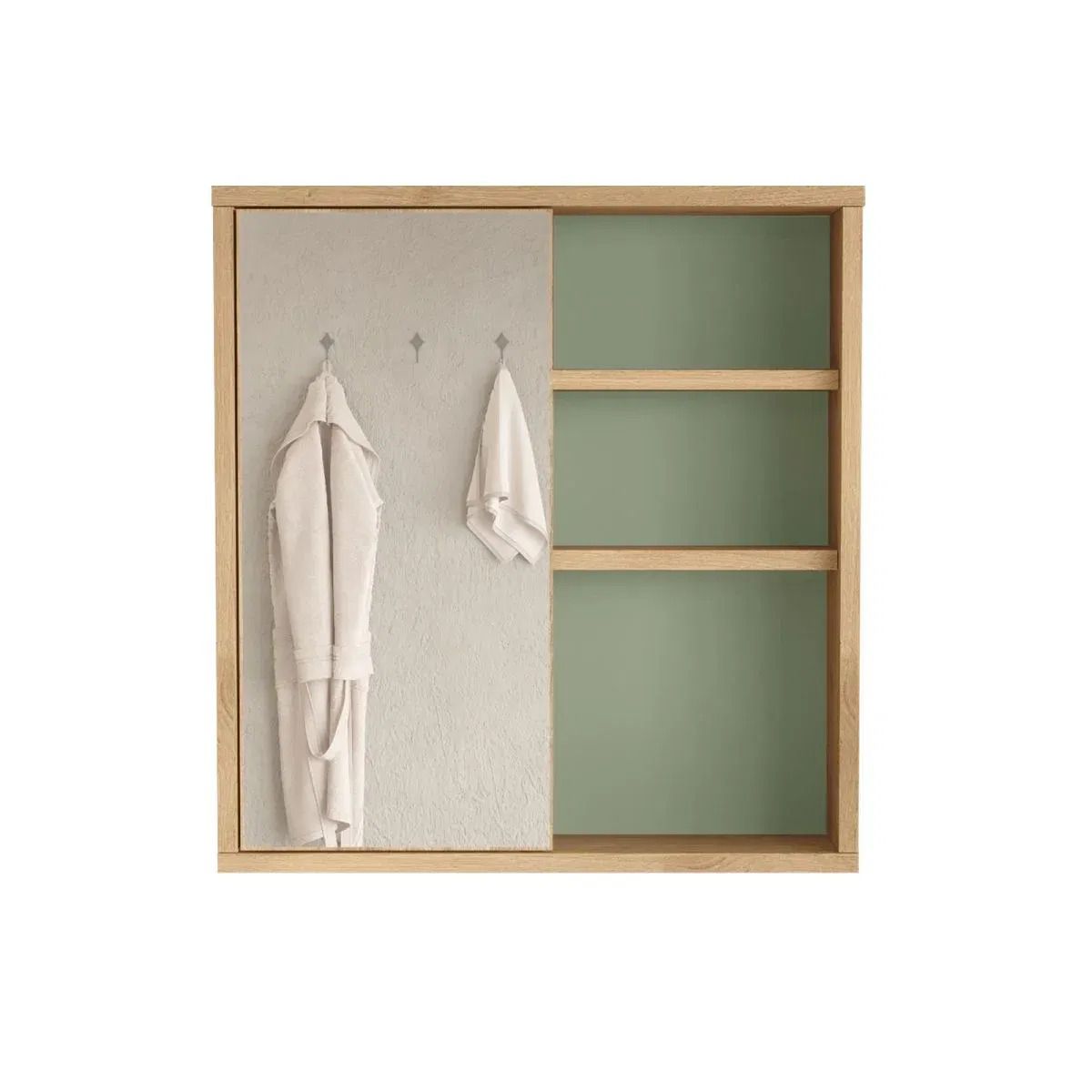 הכירו את ארון מיכל – פתרון אחסון קומפקטי ואלגנטי לחדר האמבטיה שלכם, המשלב צבע פיסטוק מרגיע עם נגיעות עץ טבעי.