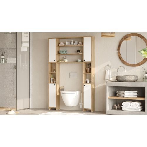 ארון שירות מעוצב בצבע עץ בשילוב עם לבן, שמביא פתרון אחסון יעיל ומודרני לחדר השירותים או המקלחת.