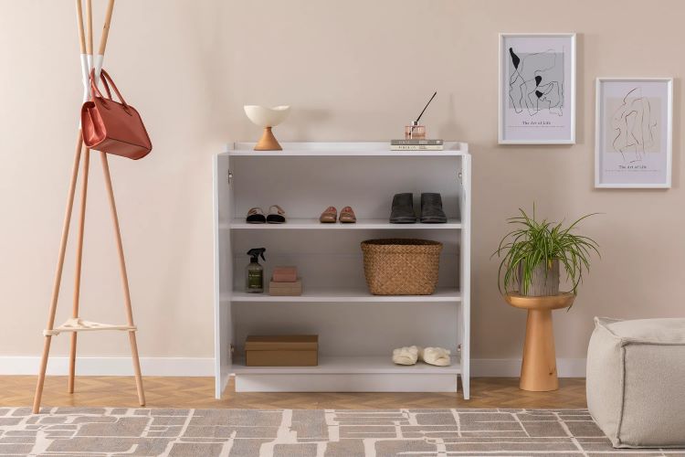 ארון שירות רב-תכליתי בעיצוב נקי בצבע לבן, מושלם לאחסון נעליים, מוצרים אישיים או כארון שירות.