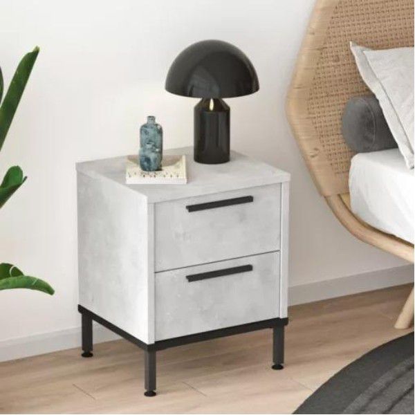 שידת הלילה Goren בעיצוב מודרני בגוון אפור עם שלדת מתכת שחורה – שילוב מדויק בין אלגנטיות תעשייתית לפונקציונליות בחדר השינה. כל שידה כוללת 2 מגירות מרווחות בגימור מלמין עמיד, לאחסון נוח של חפצים אישיים ליד המיטה.