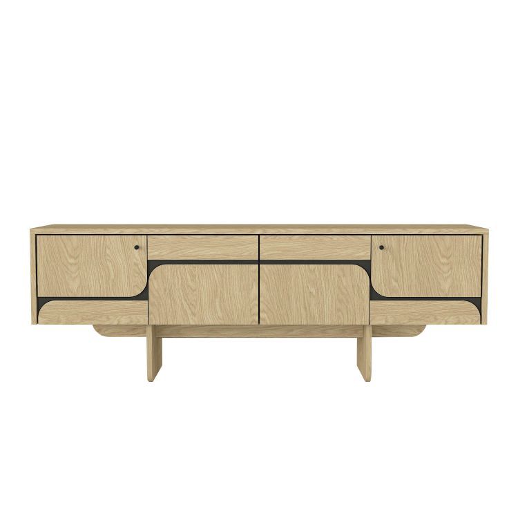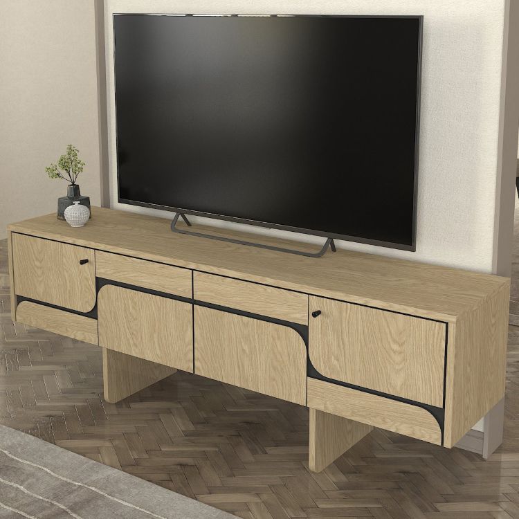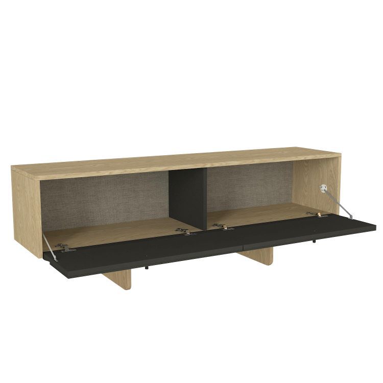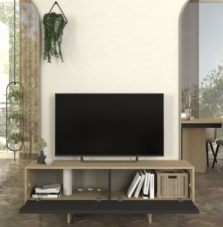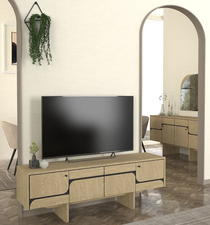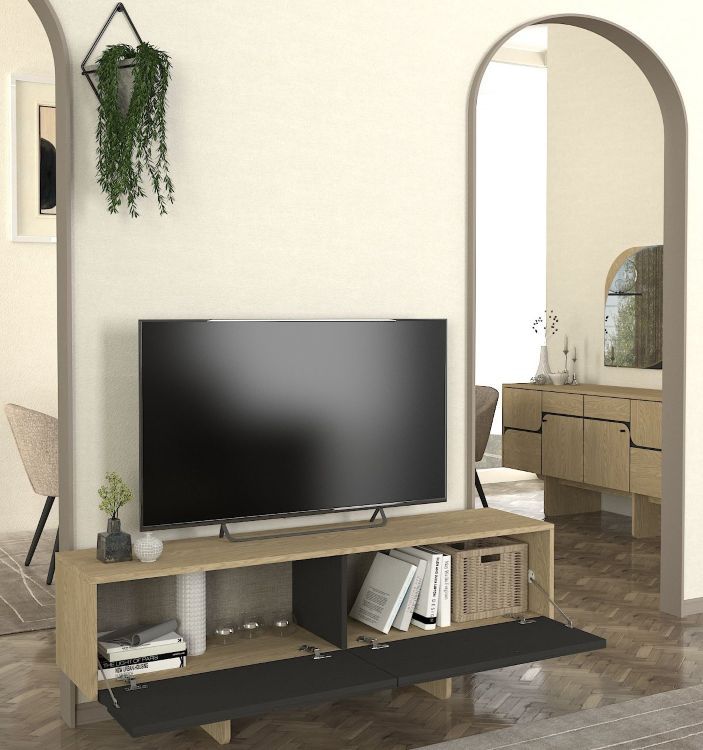 מזנון הטלוויזיה “ספיר” מסדרת Eclipse מבית Twins Design מציע פתרון אחסון מעוצב ומרשים, המשלב אסתטיקה מודרנית עם קווים אורגניים רכים. המזנון, שרוחבו 150 ס”מ, מתאפיין בשילוב של גימור עץ בגוון אלון בהיר עם שתי דלתות הנפתחות כלפי מטה ומשלבות צבע אפור כהה. במרכז המזנון יש חלל פתוח המיועד למכשירי מדיה, ושתי הדלתות הממוקמות בצדדים מספקות פתרון אחסון נוח ודיסקרטי. השילוב הניגודי של צבעים וטקסטורות יוצר מראה אלגנטי, מתוחכם ועל-זמני._x000D_