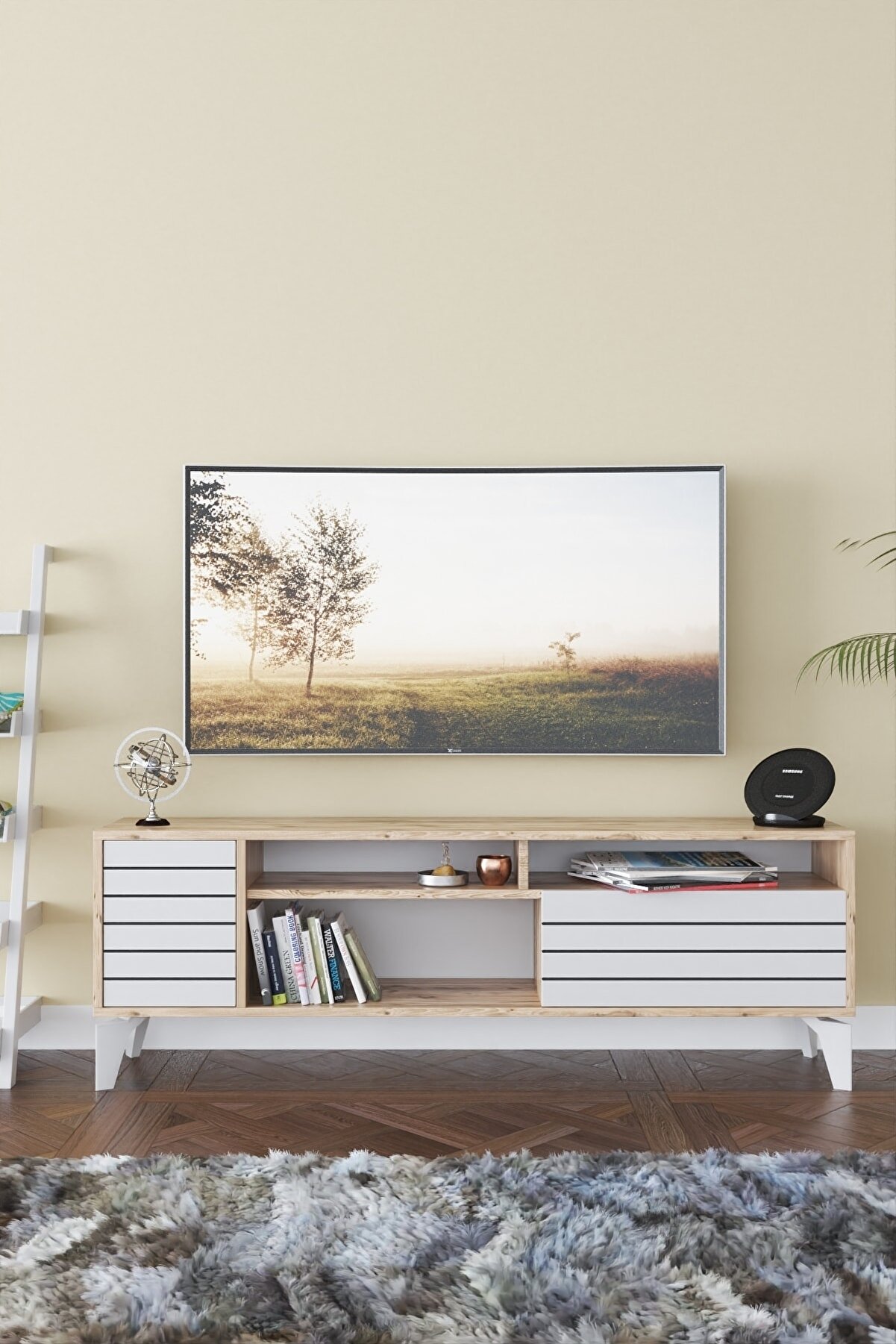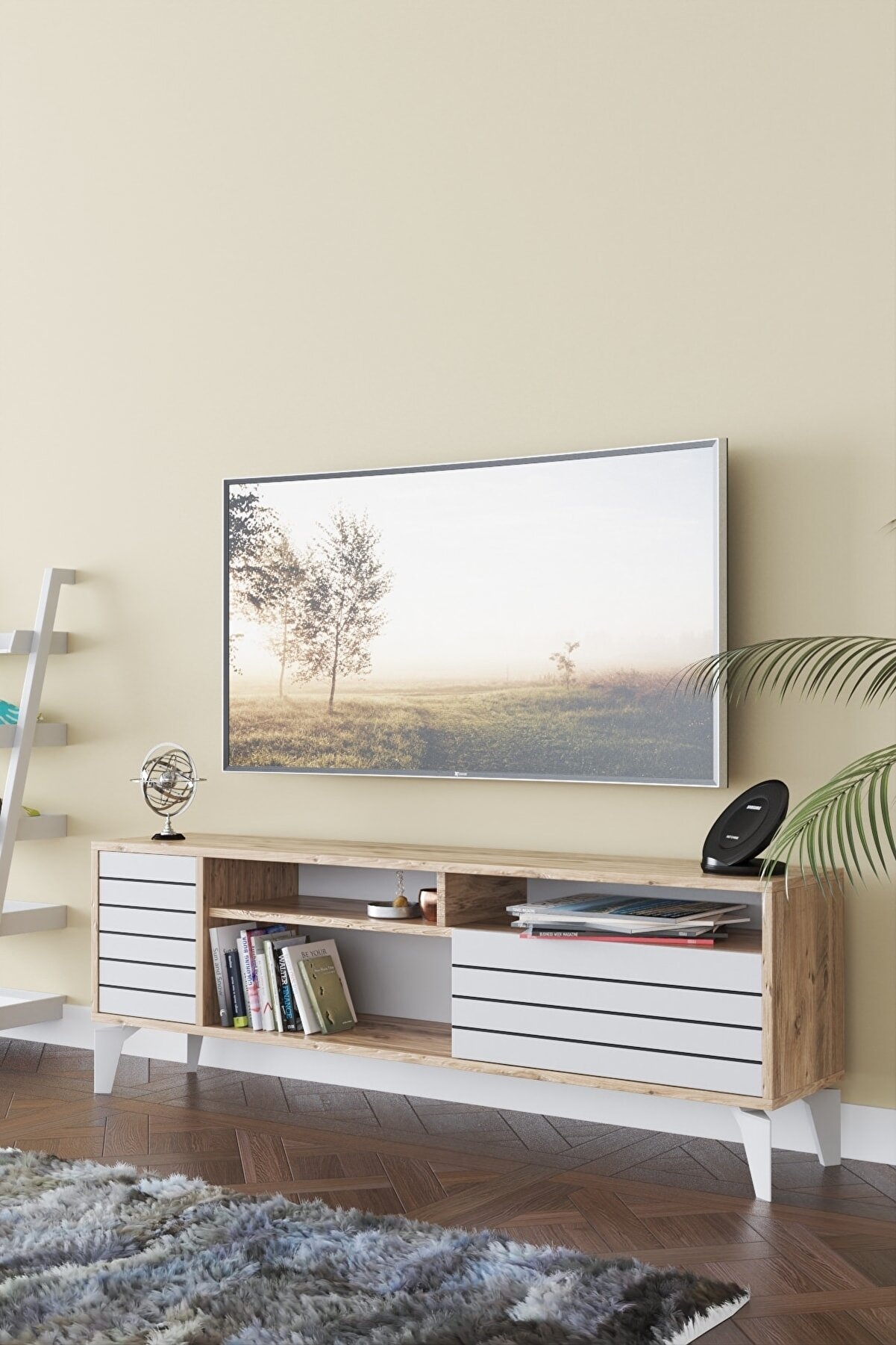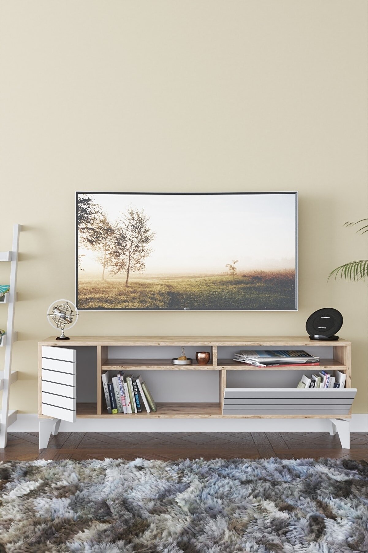 למזנון יש מדפים פתוחים להנחת פליסטיישן ממיר ועוד