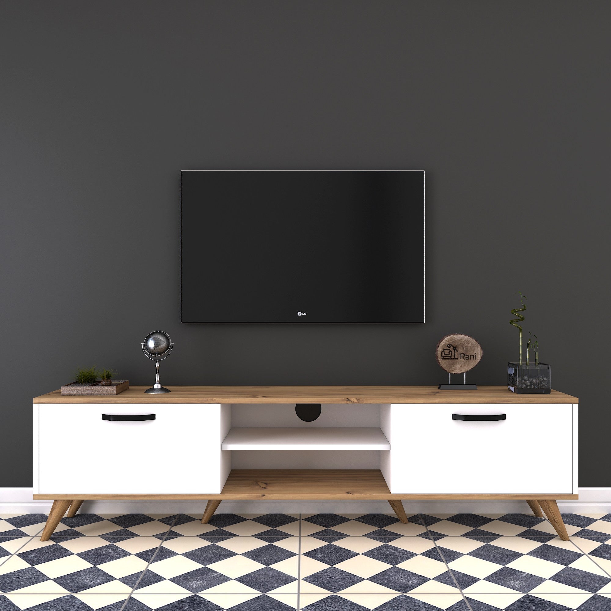 מזנון עומד בצבע לבן בשילוב עץ טבעי