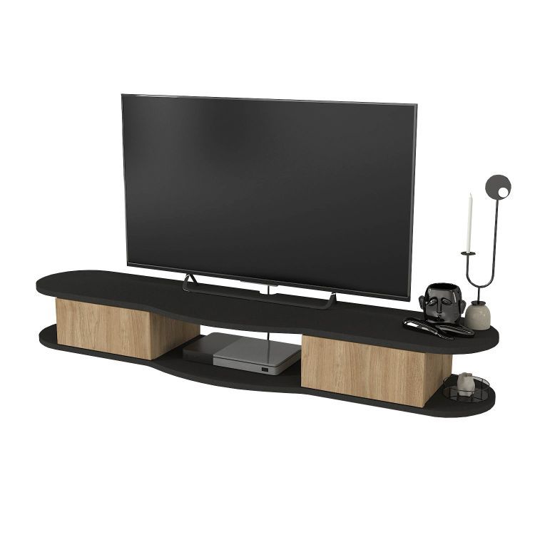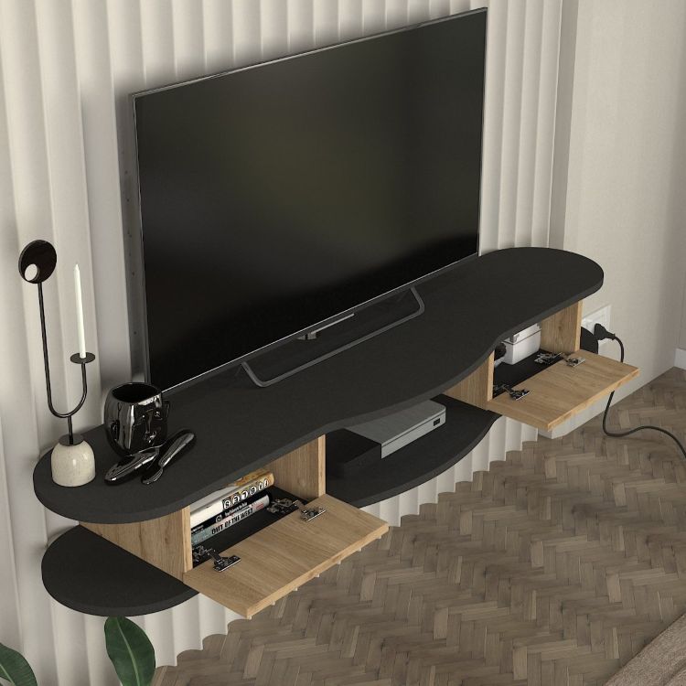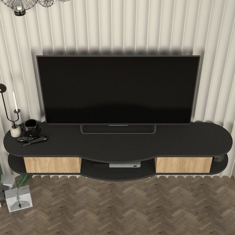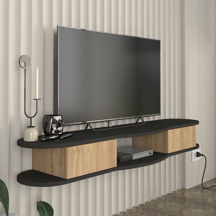 המבנה כולל שני מדפים חיצוניים להצגת פריטי נוי או להצבת ממירי טלוויזיה, לצד שתי דלתות נפתחות כלפי מטה שמעניקות פתרון אחסון נוח ודיסקרטי לחפצים שונים. השילוב בין אפור כהה לעץ בהיר יוצר ניגודיות עיצובית אלגנטית, שמוסיפה חמימות וסטייל לכל חלל._x000D_