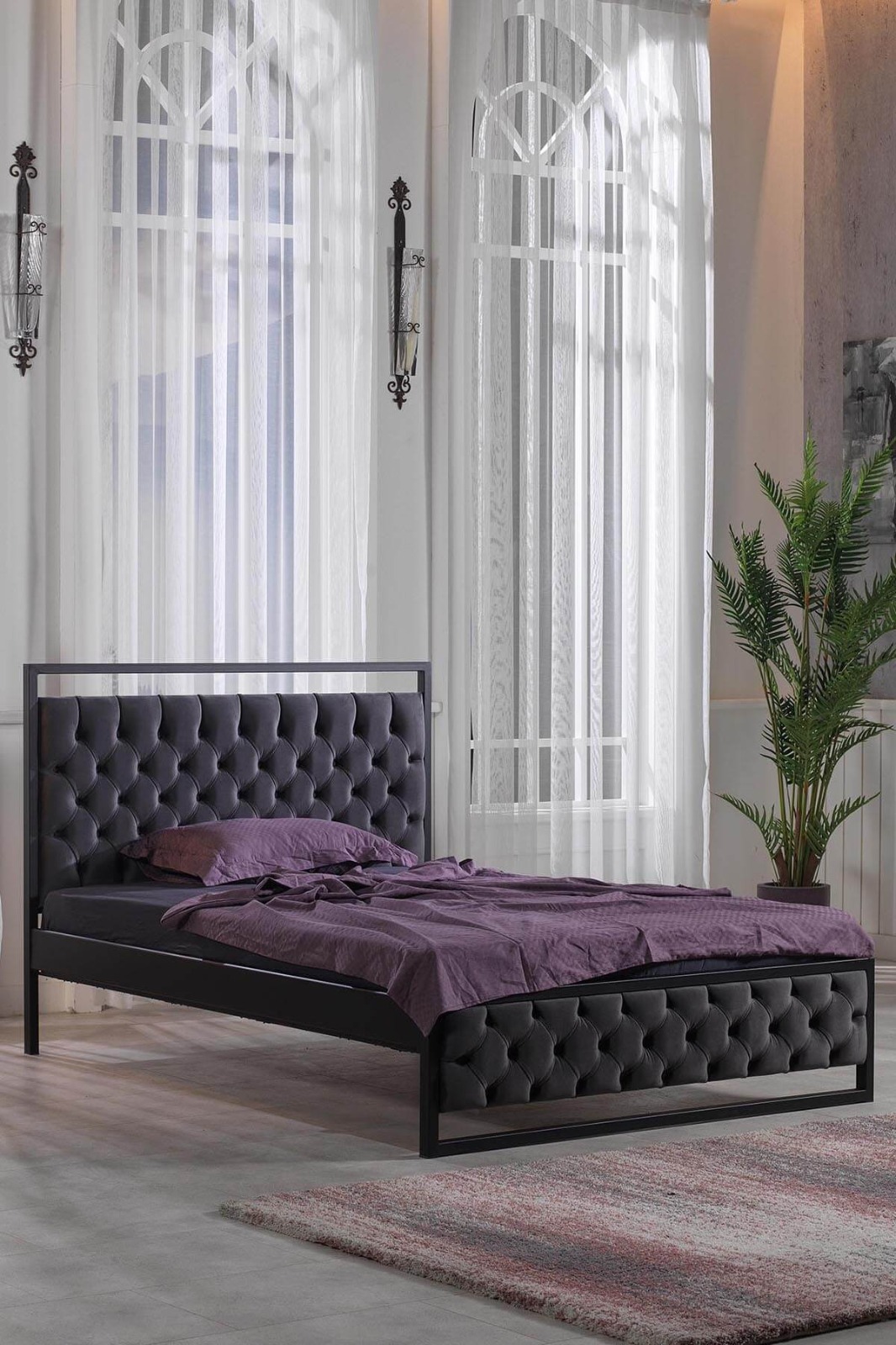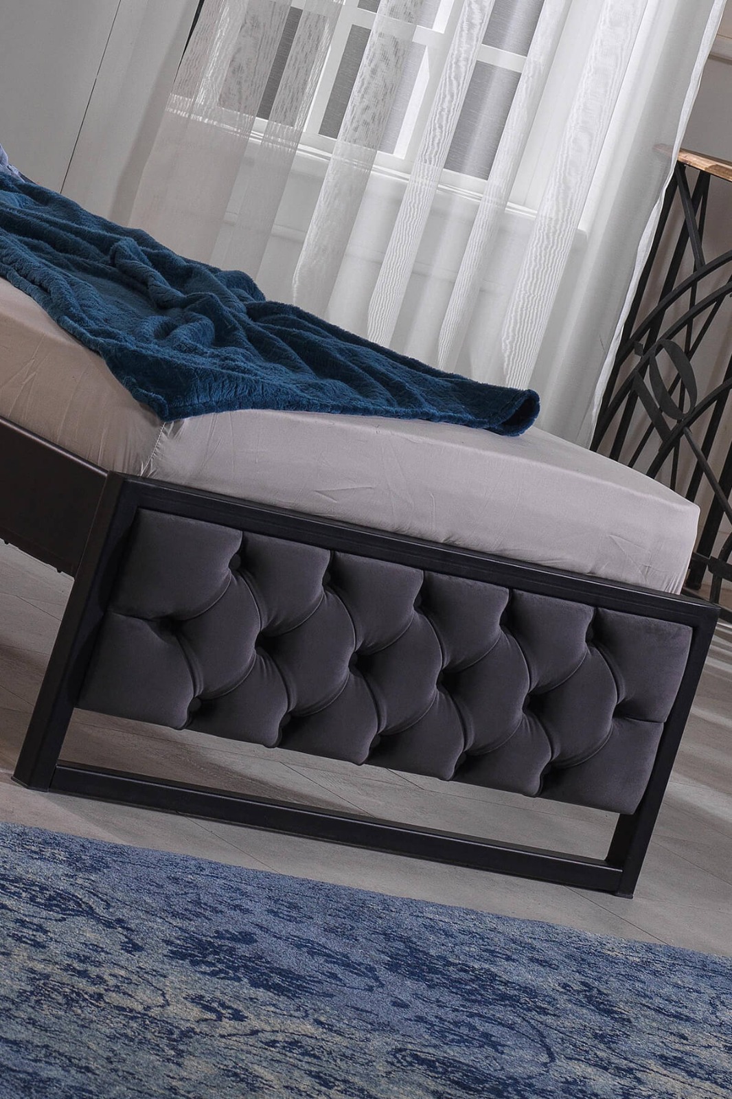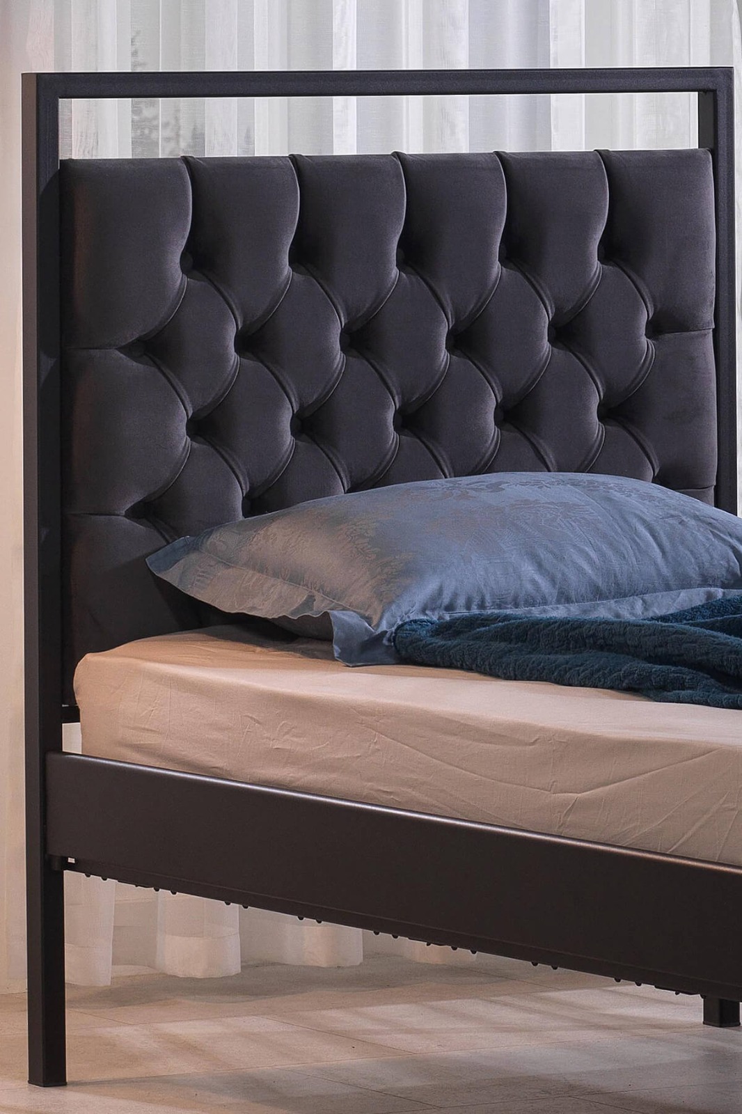 מיטת מתכת בשילוב בד.