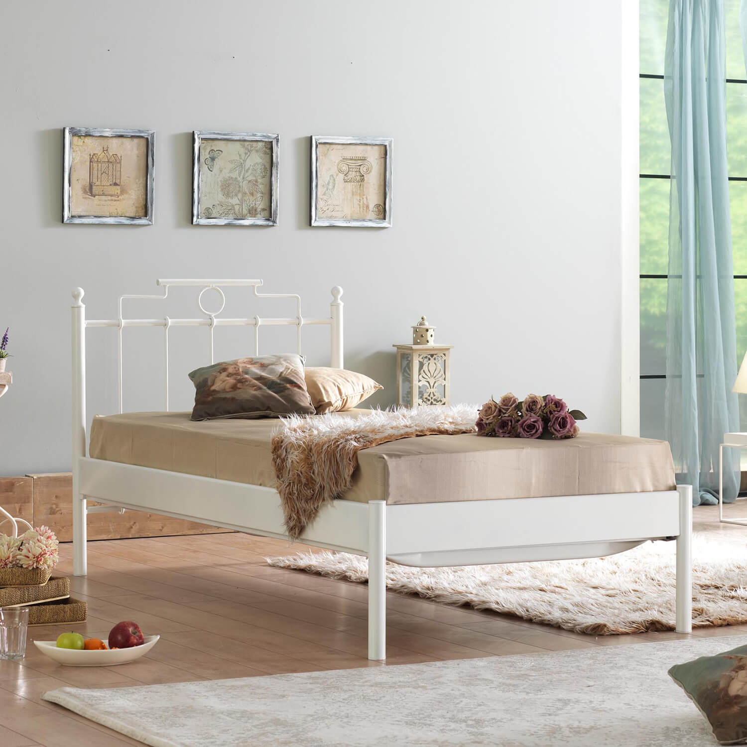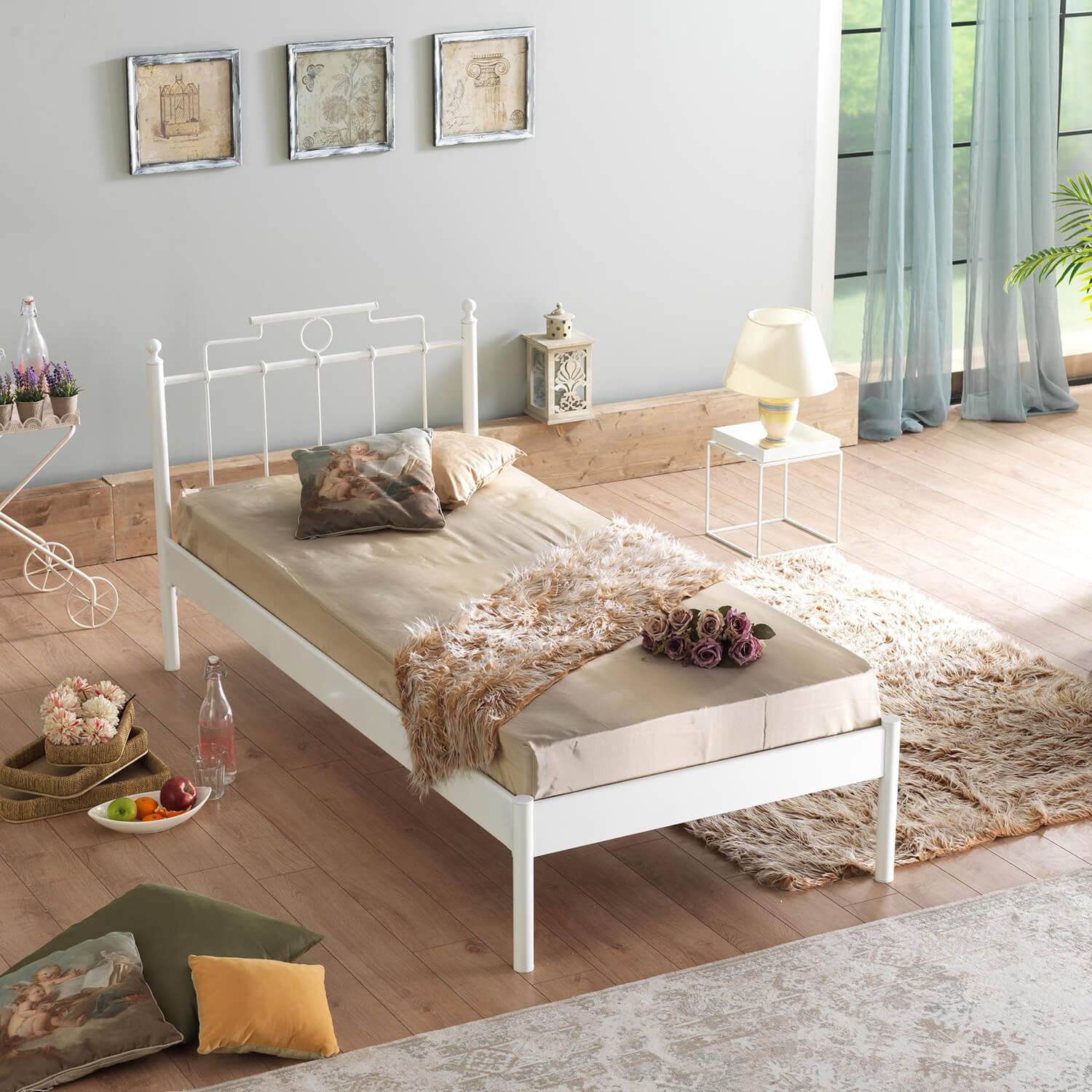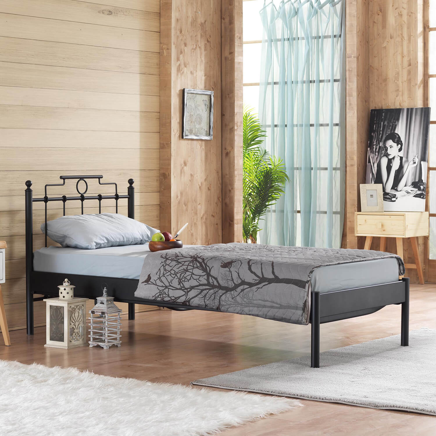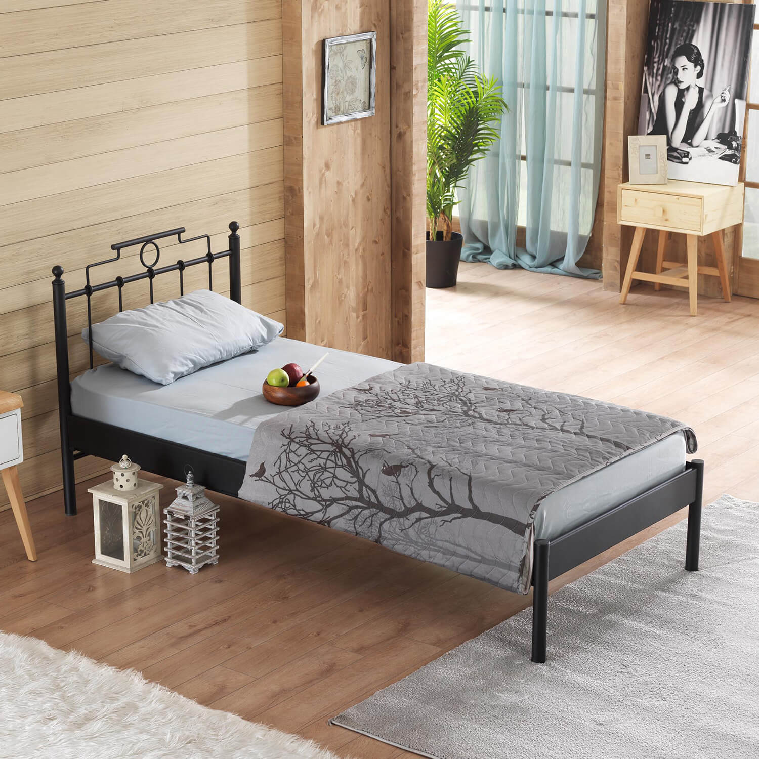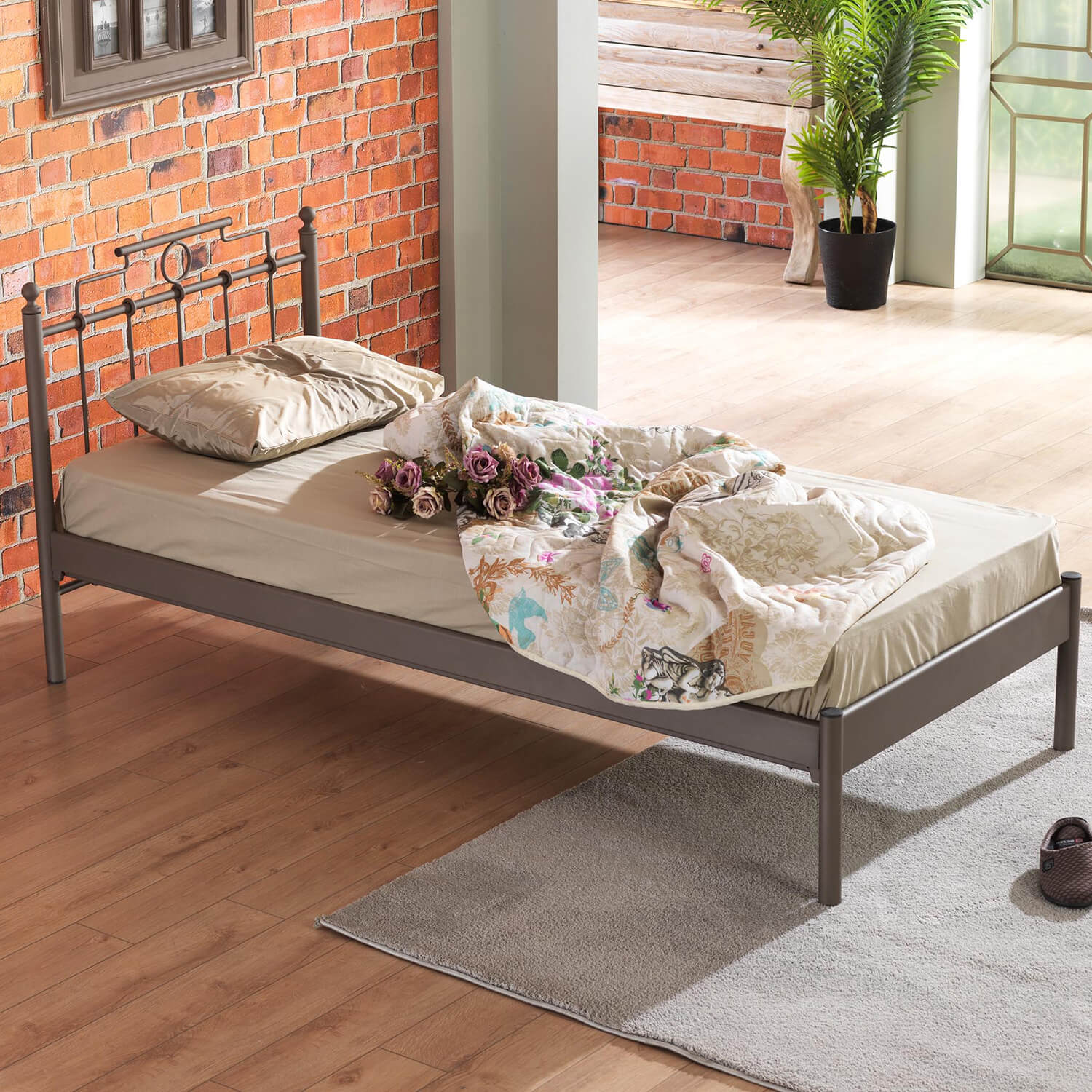 מיטת יחיד עשויה מתכת בסגנון צעיר ורענן.