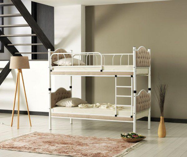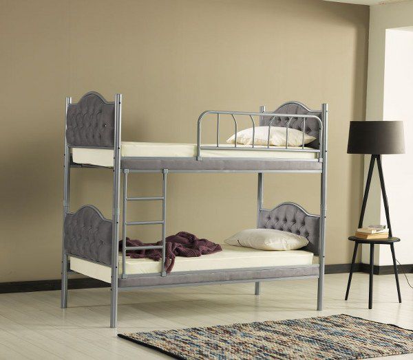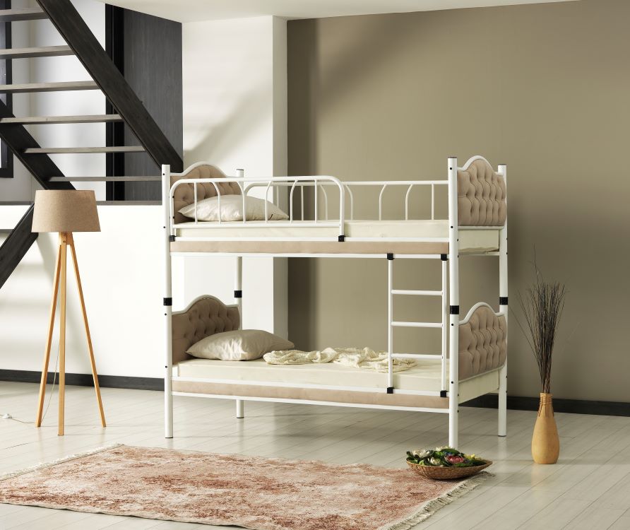 מראה ייחודי המשלב מתכת איכותית במיוחד ובד יוקרתי. בסיס בנוי מלייסט מתכת מאסיבי ועליו דיקט עץ לבוד יציב, מסגרת המיטה מחוזקת ע”י מוטות מתכת המעניקים בטיחות מושלמת למיטה ותמיכה למזרן.כמו כל המוצרים שלנו ובמיוחד כל מה שקשור לחדרי ילדים, גם מיטת הקומותיים עומדת בסטנדרטים גבוהים של איכות ובטיחות, המיטה העליונה בעלת מסגרת גבוהה ומעקה הגנה מאסיבי השומר על הילד מכל הכיוונים ומגן ראש מרופד בבד איכותי ונעים.בין שתי המיטות מותקן סולם יציב המאפשר טיפוס לקומה השנייה וירידה ללא חשש וניתן להתאים את צד הסולם והמעקה לפי דרישה וצורך.על מנת לעצב לילדים חדר מדליק ונעים, ניתן להתאים את המיטה לאופי ולטעם האישי באמצעות בחירה מבין שלל צבעים מרהיבים, לרבות: אפור בשילוב מתכת אפורה, ורוד בשילוב מתכת לבנה, בז’ בשילוב מתכת לבנה.