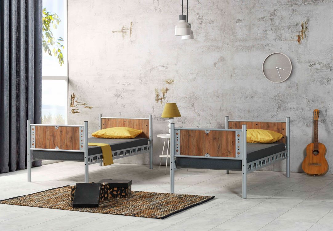 המיטה עשויה ממתכת בשילוב עץ במרקם ייחודי. מסגרת המיטה מחוזקת