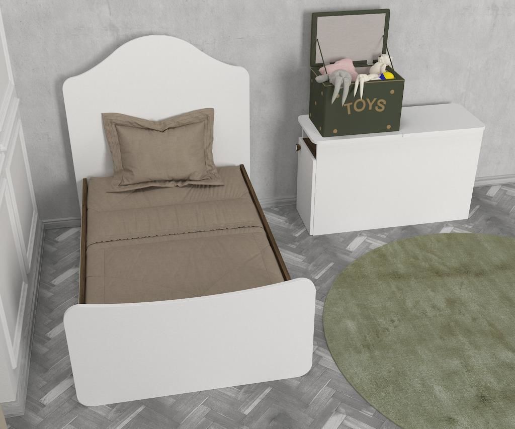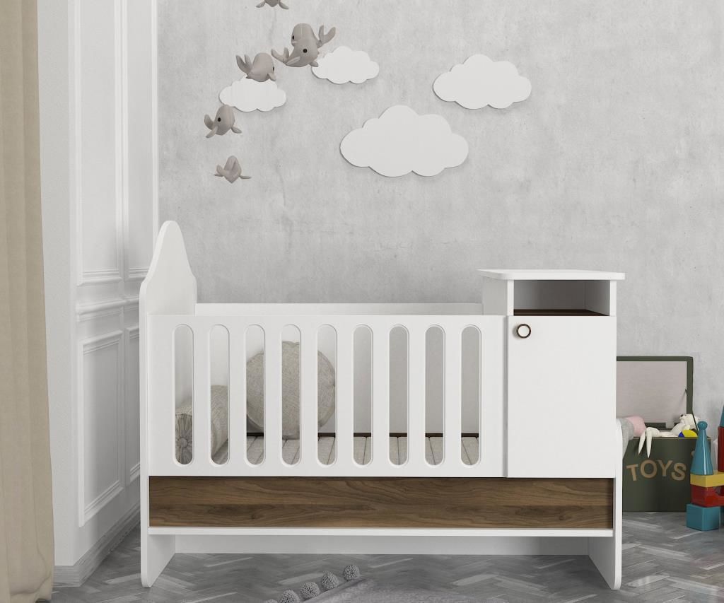 מיטת תינוק הכוללת שידה והופכת למיטת מעבר בצבע לבן, מעוצבת בקוים נקיים