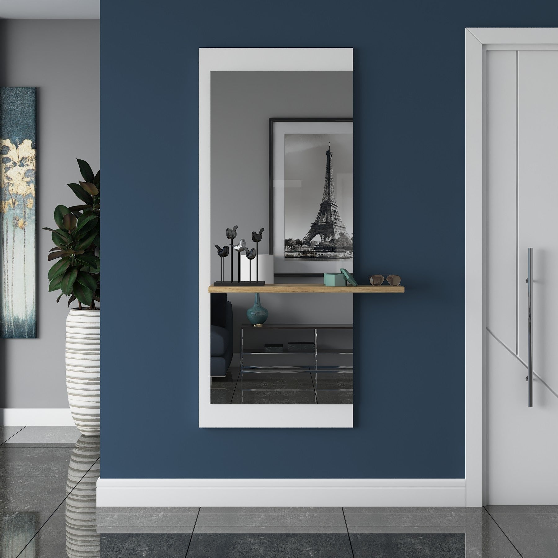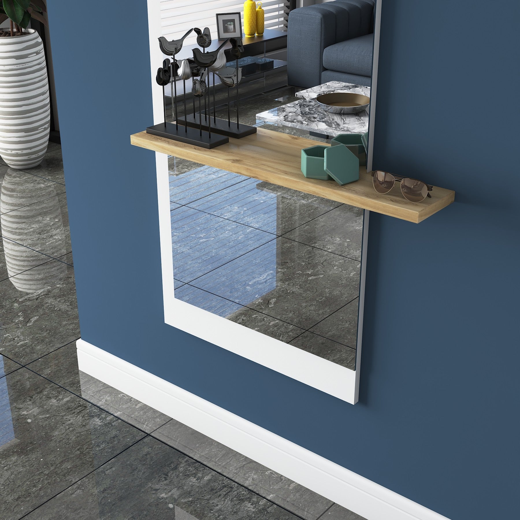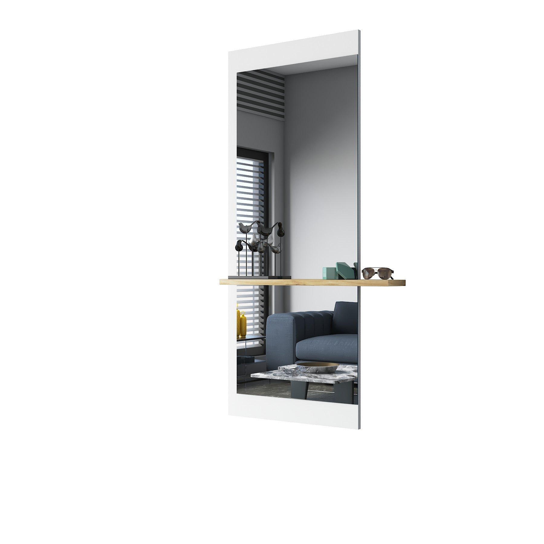 למראה יש מדף עשוי עץ עליו ניתן להניח חפצים כגון בשמים