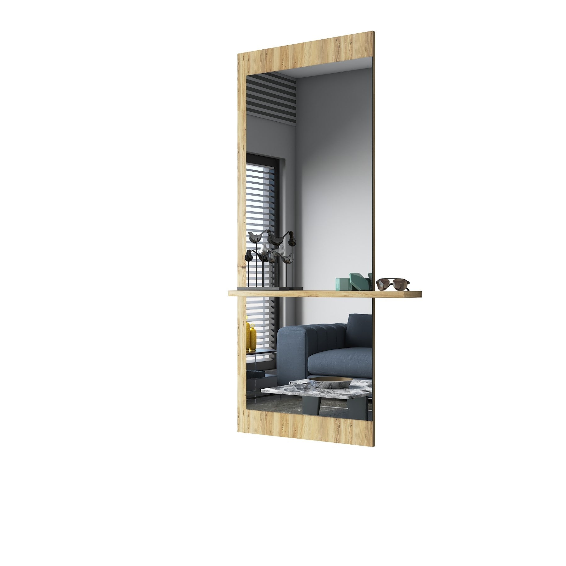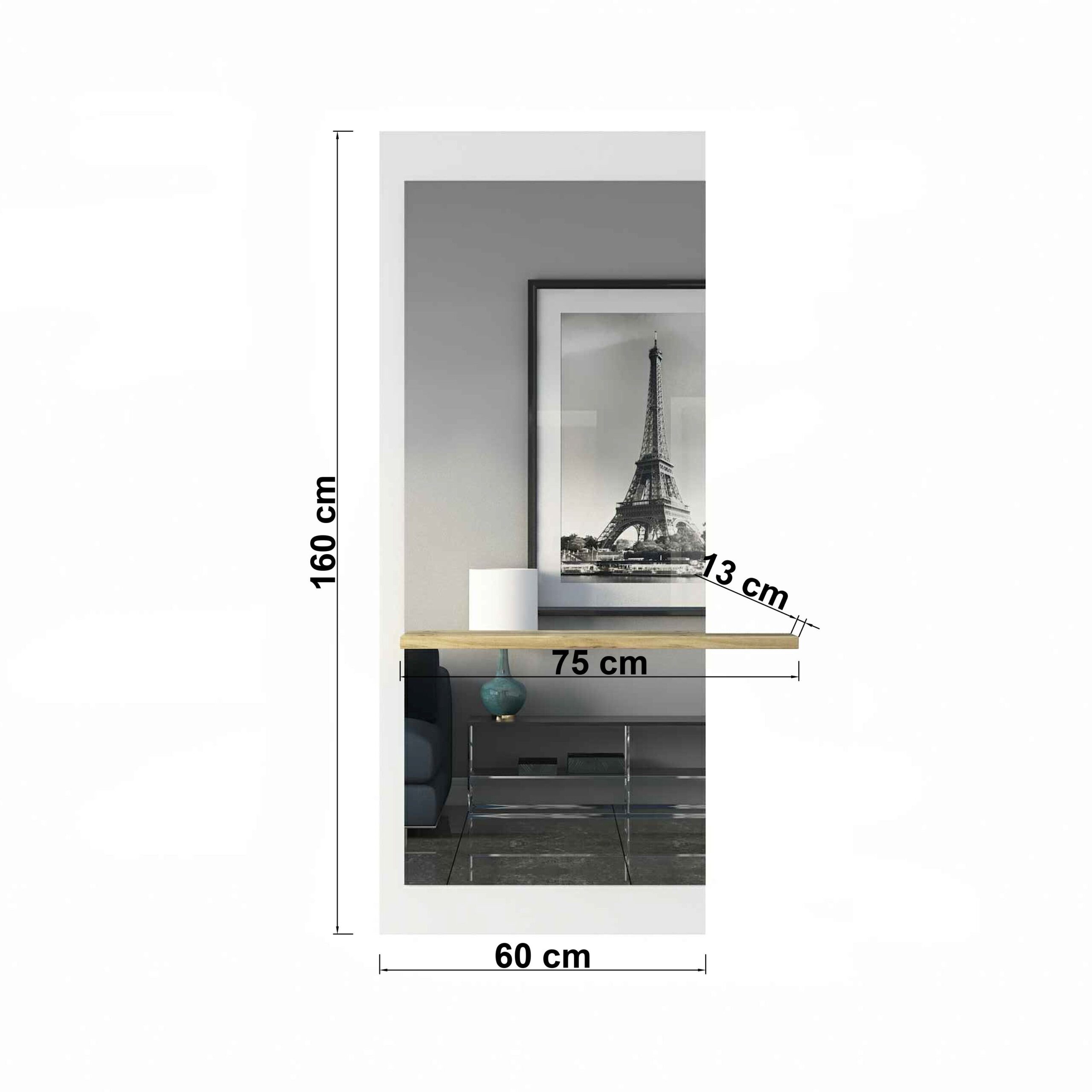 למראה יש מדף עשוי עץ עליו ניתן להניח חפצים כגון בשמים