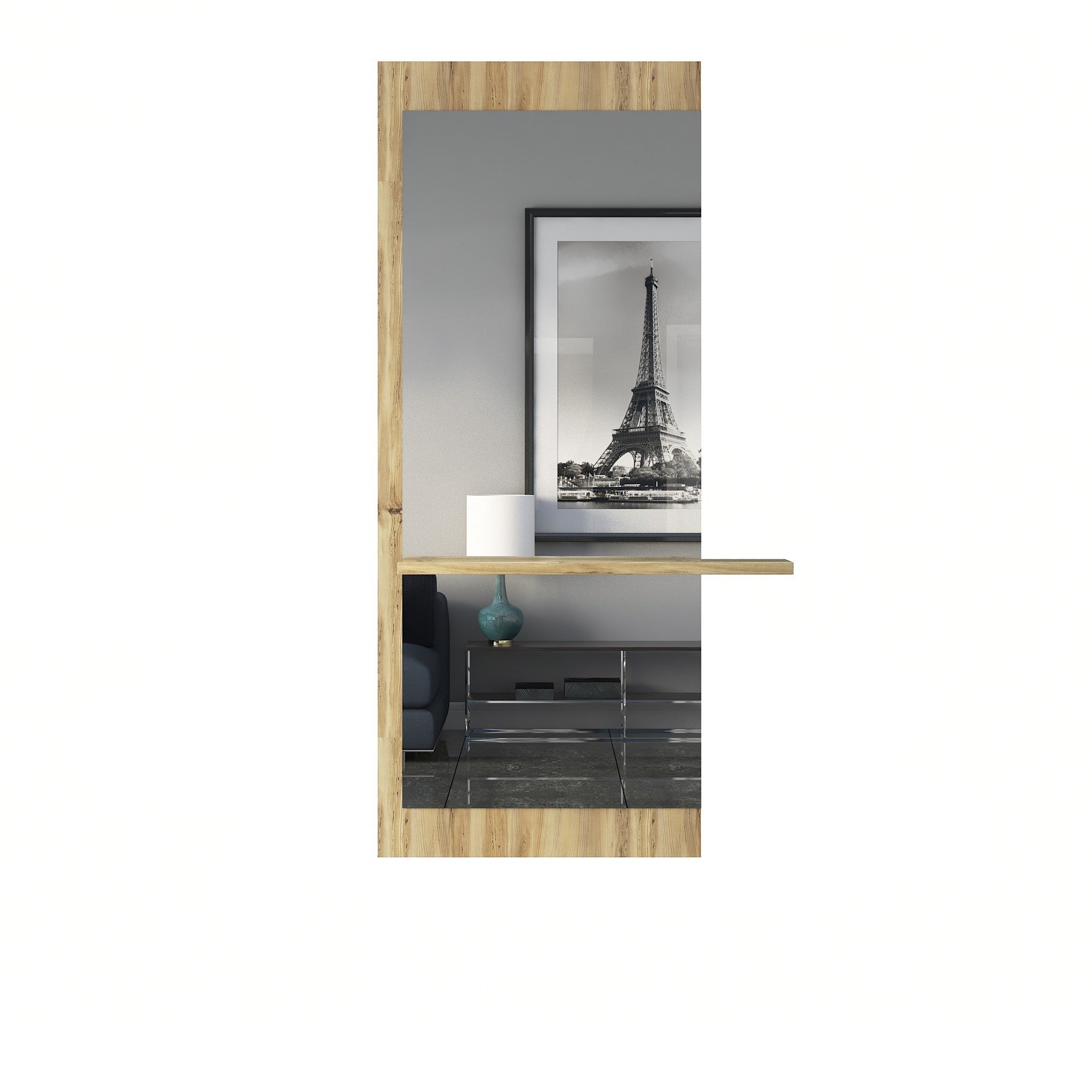מראה דקורטיבית על בסיס רקע דמוי עץ בהיר
