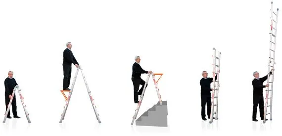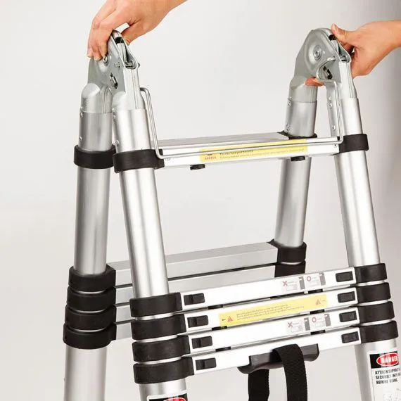 הסולם נפתח לגובה של 2 מטרים במצב כפול ולאחר מכן ניתן לישר את מפרק הסולם ולהאריכו עד לגובה של 3.8 מטרים כסולם בודד עם בסיס בטוח ורחב.