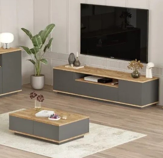הסט המושלם לעיצוב סלון פונקציונלי ומעוצב: מזנון מרווח עם מדף פתוח ותאי אחסון סגורים, ושולחן קפה עם שטח אחסון פנימי נסתר. השילוב של גוון עץ טבעי עם אפור מט יוצר מראה אלגנטי, חמים ונקי – אידיאלי לבית בעיצוב מודרני או סקנדינבי.