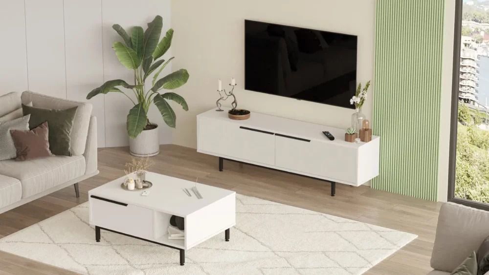 שדרגו את הסלון שלכם עם סט רהיטים אלגנטי הכולל מזנון טלוויזיה ושולחן סלון בגוון לבן נקי.