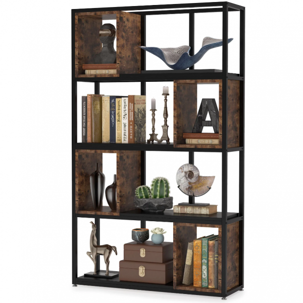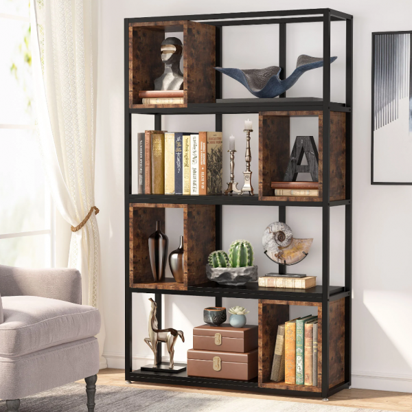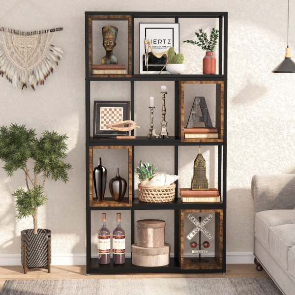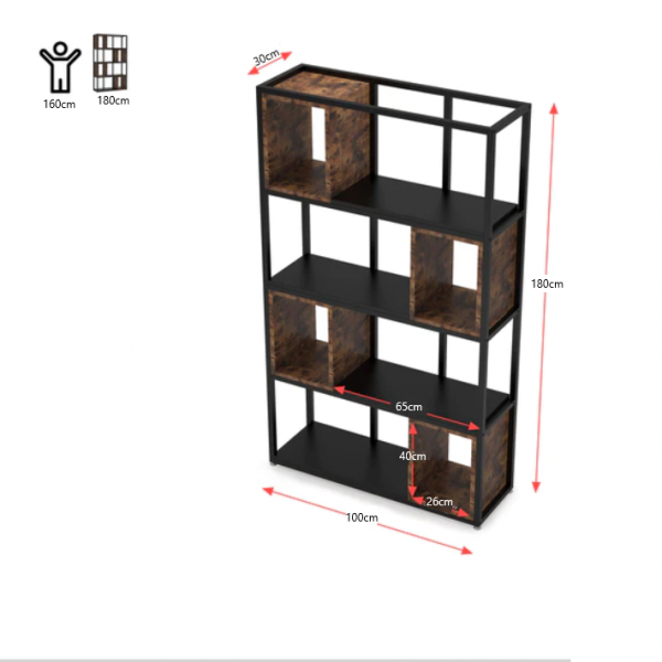 ספריה מעוצבת דגם סהר מבית Twins Design בצבע שחור משולב חום כהה, עם מגוון רחב של מדפים להנחת חפצי נוי