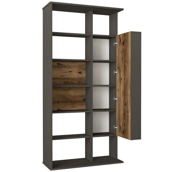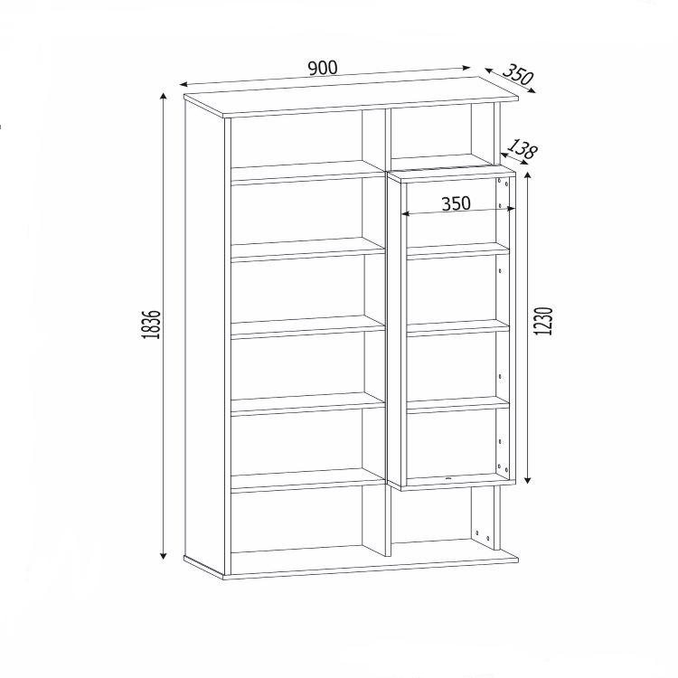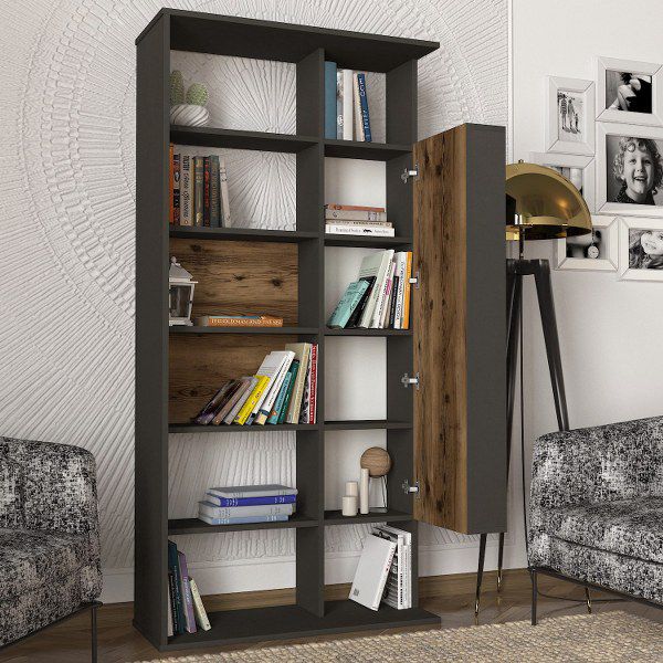 לספריה מגוון מדפים בגדלים שונים ובנוסף דלת עם מדפים חיצונים שנפתחת ובה גם מדפים פנמיים