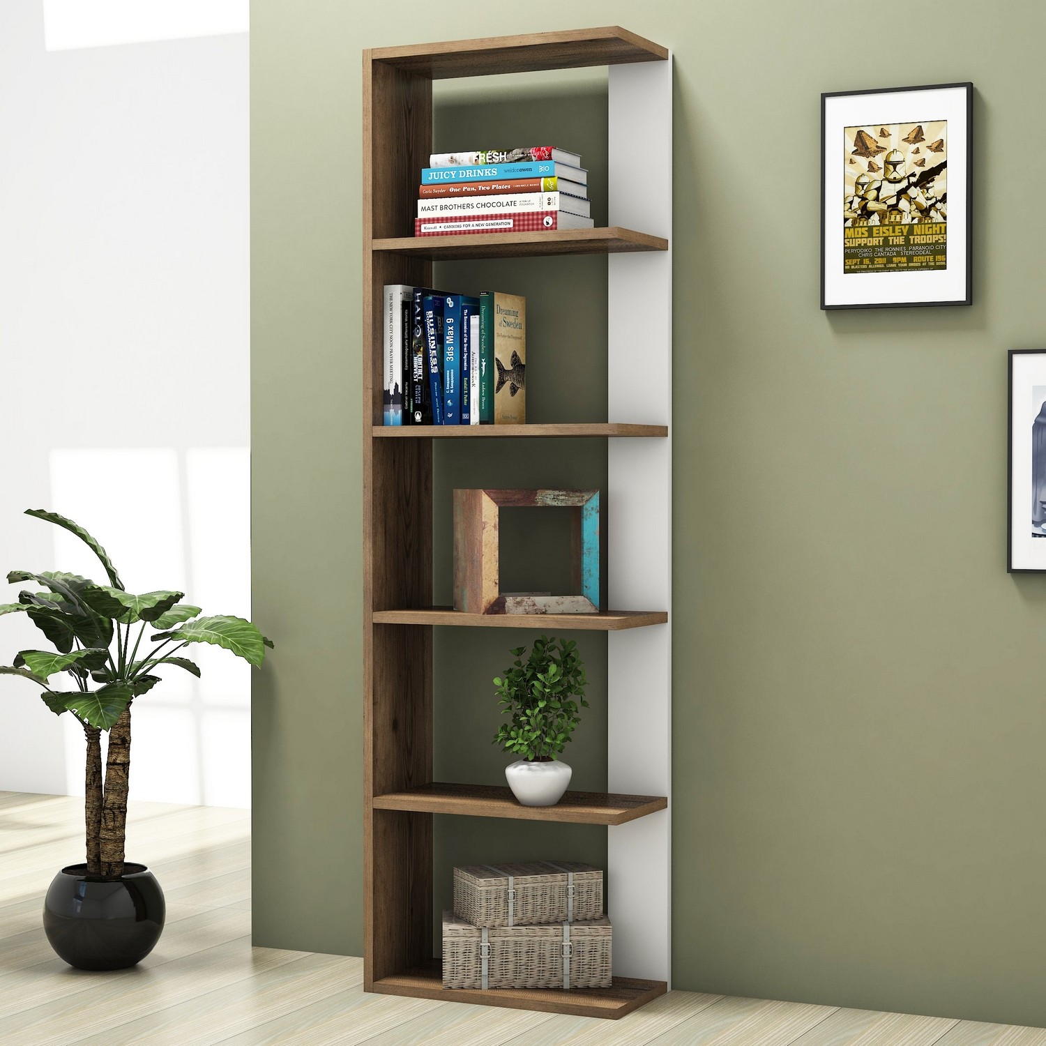 חמישה מדפי עץ רחבים במיוחד לנוחות מקסימלית, מדפי עץ עבים וחזקים המתאימים לנשיאה של חפצי נוי, קלסרים וספרים