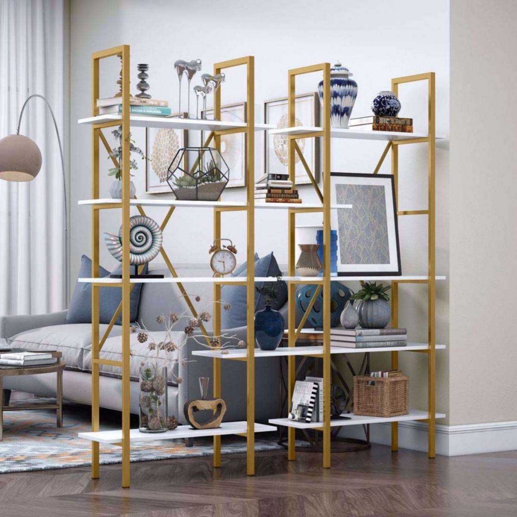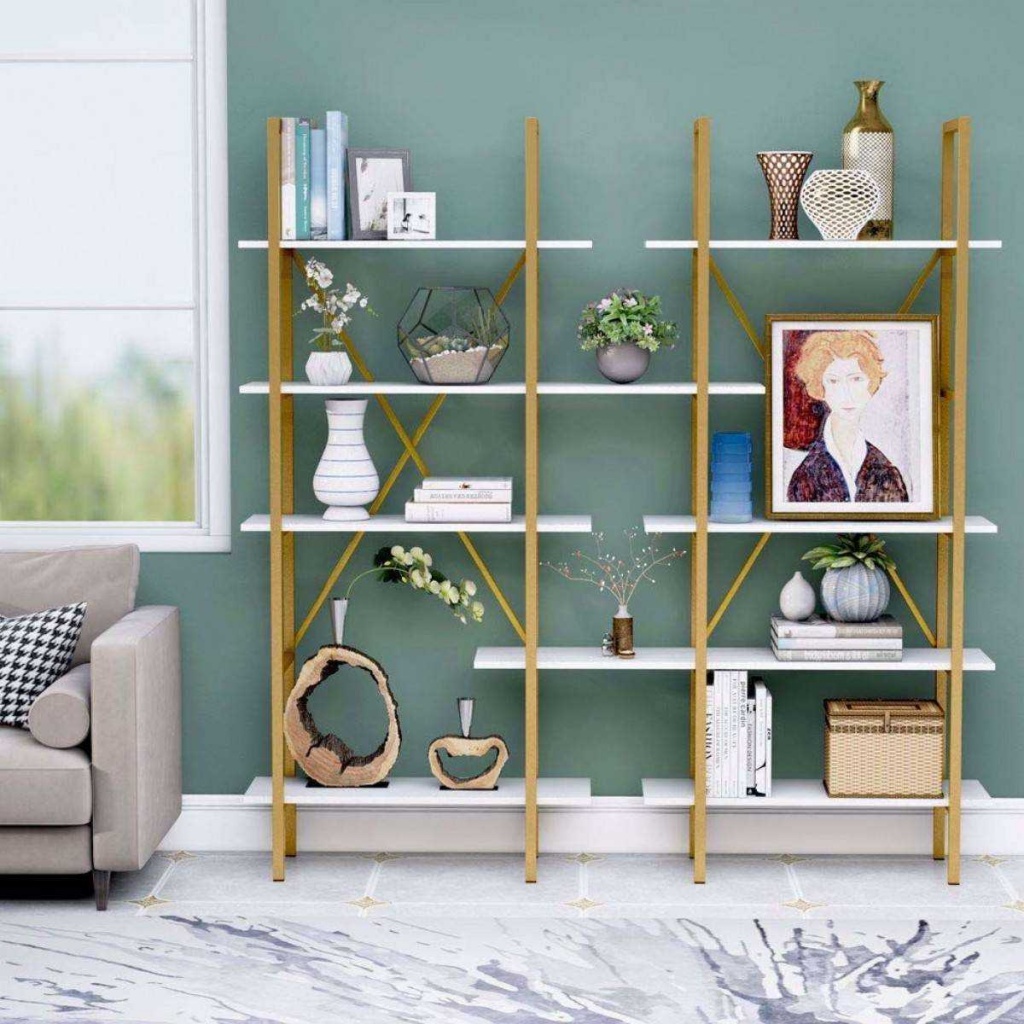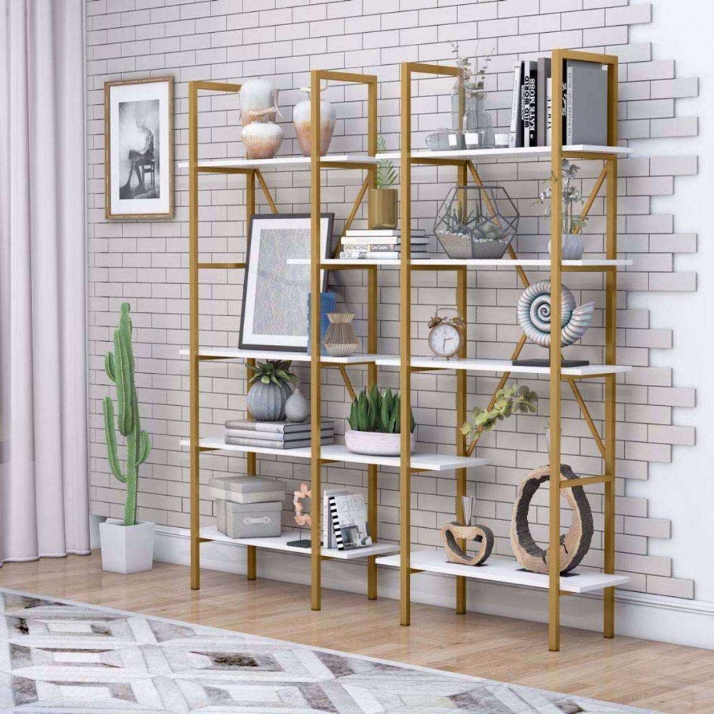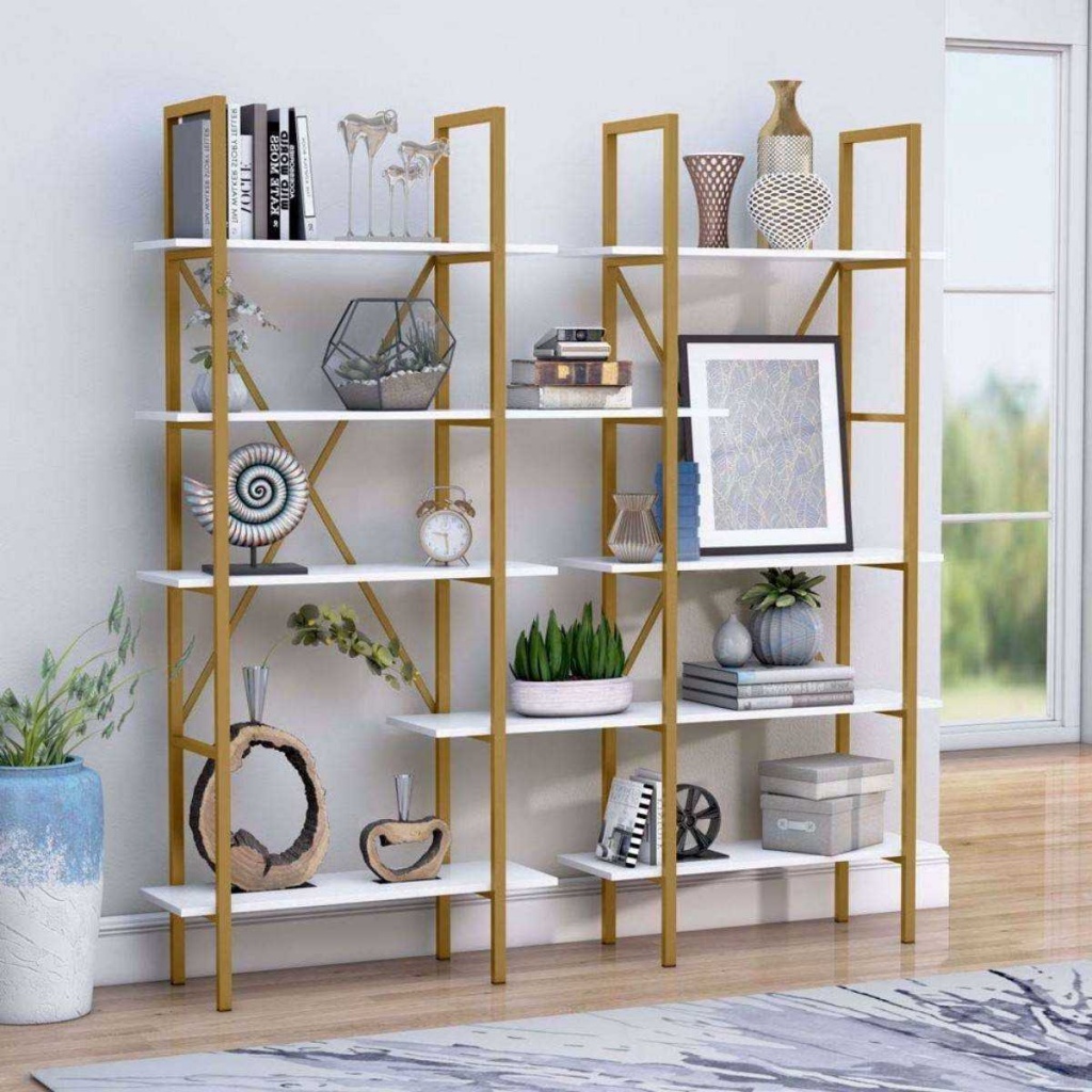 ספריית מדפים מעוצבת עשויה מתכת דמוי זהב בשילוב עץ לבן
