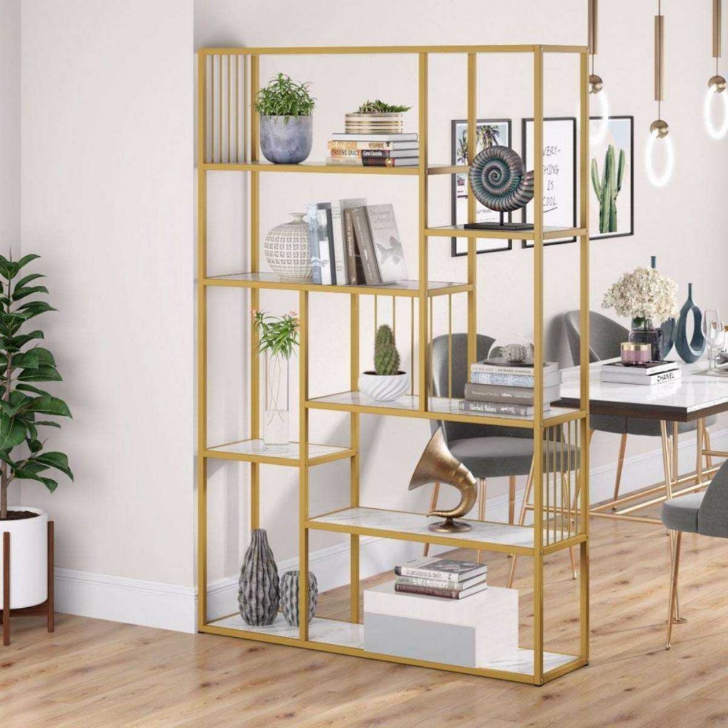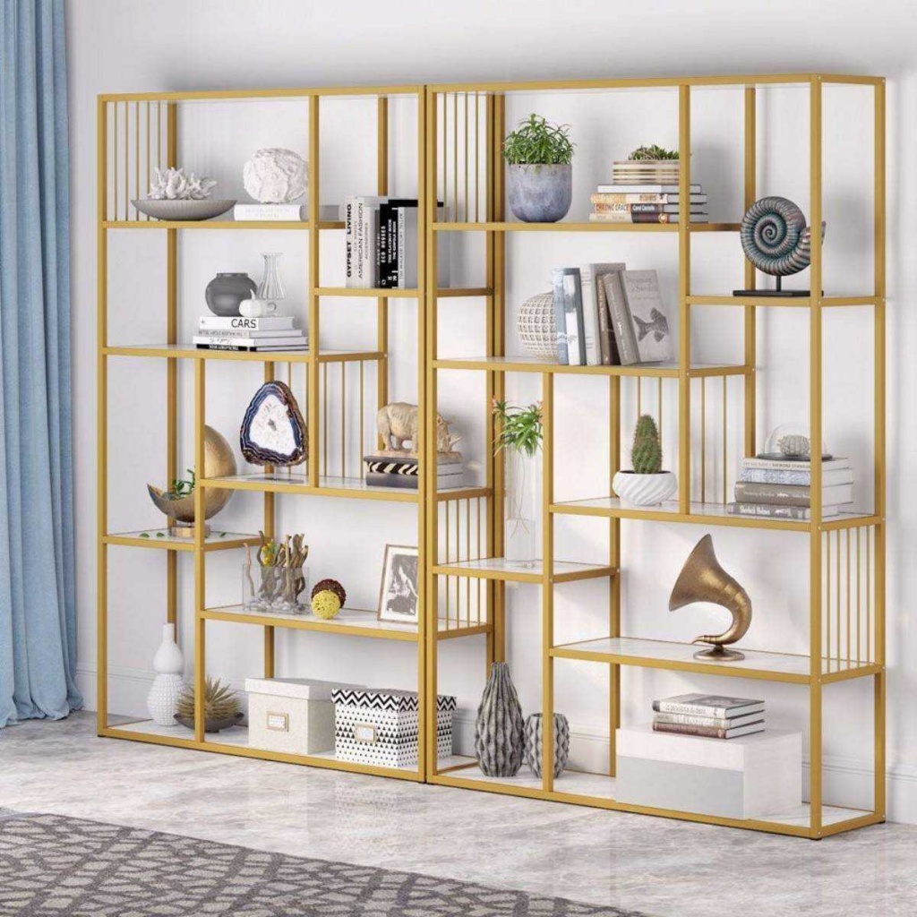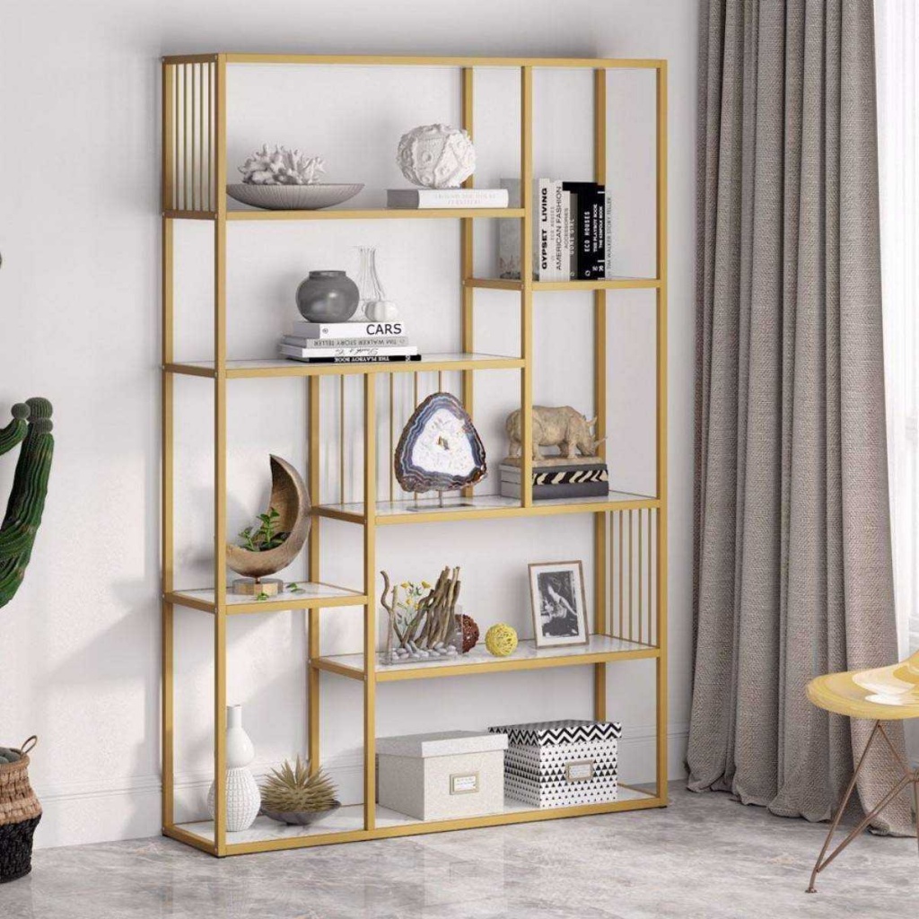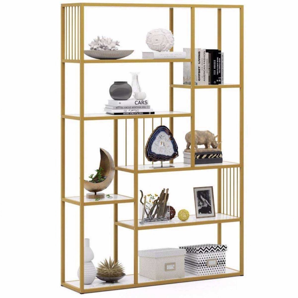 ספריית 7 מדפים מעוצבת עשויה מתכת זהב בשילוב עץ לבן