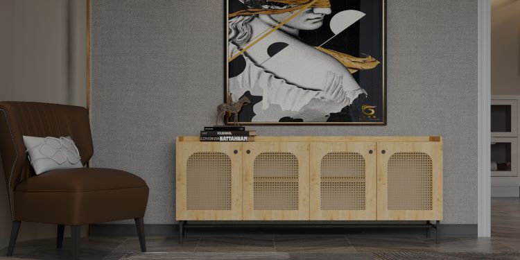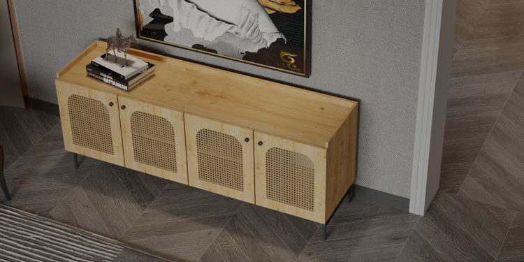 קונסולה מעוצבת בצבע עץ בשילוב בד ראטן