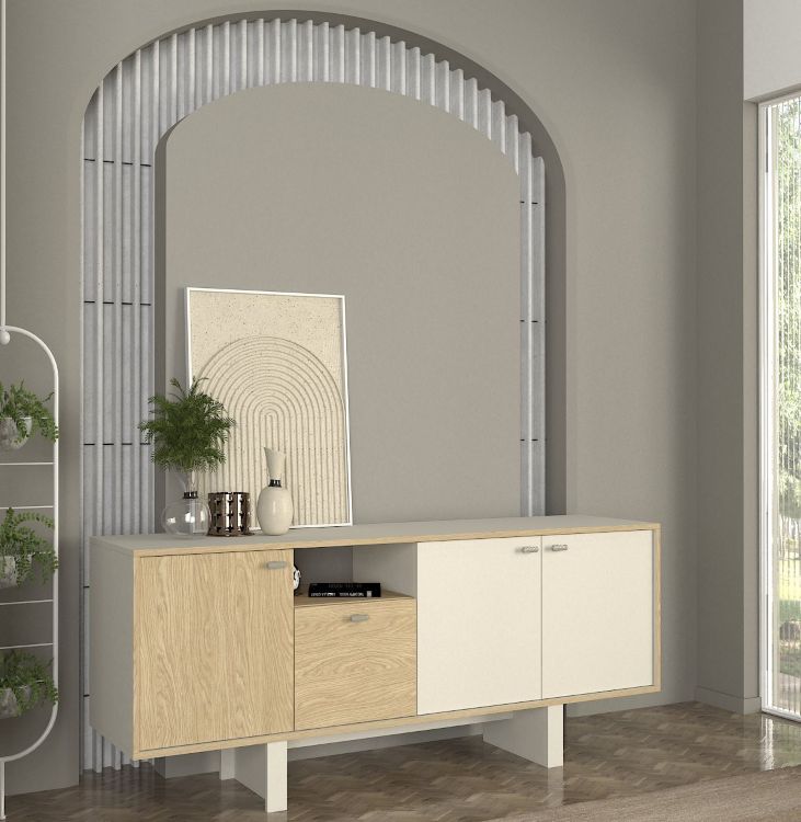 הביאו חמימות וסטייל לחלל הבית שלכם עם קונסולה דגם נלה. העיצוב סקנדינבי-מודרני משלב קווים נקיים עם גימור דמוי עץ אלון טבעי וצבעים בהירים, מעניק לחלל מראה נעים, מואר ואוורירי._x000D_