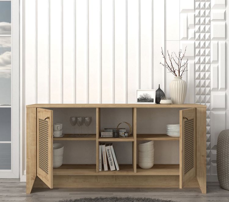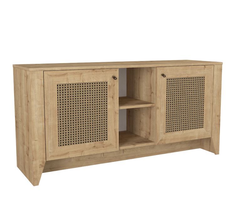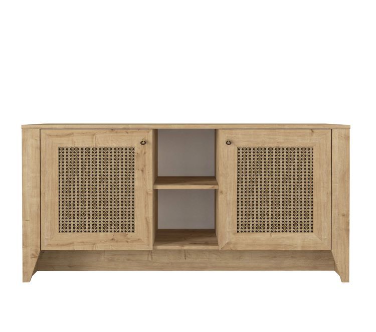 הקונסולה עשויה עץ מעובד איכותי בגוון טבעי, ומשולבת ברצועות דמוי ראטן – מה שהופך אותה לרהיט מעוצב עם תחושת טבע חמימה שמתאימה לכל עיצוב פנים.