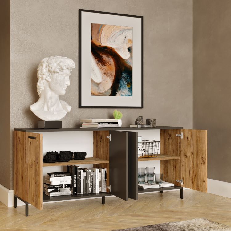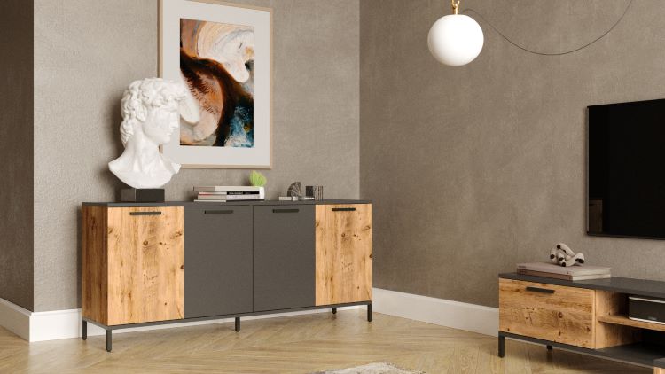 קונסולה מעוצבת בקווים חדשניים שמשלבים צבע עץ עם אפור, ומציעה פתרון אחסון פונקציונלי ומרשים.