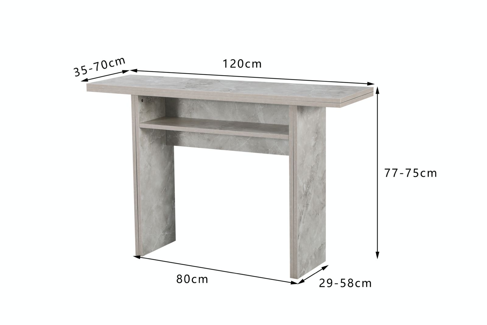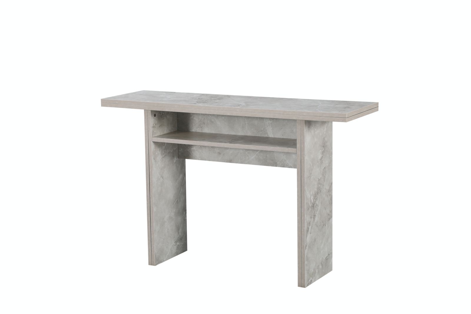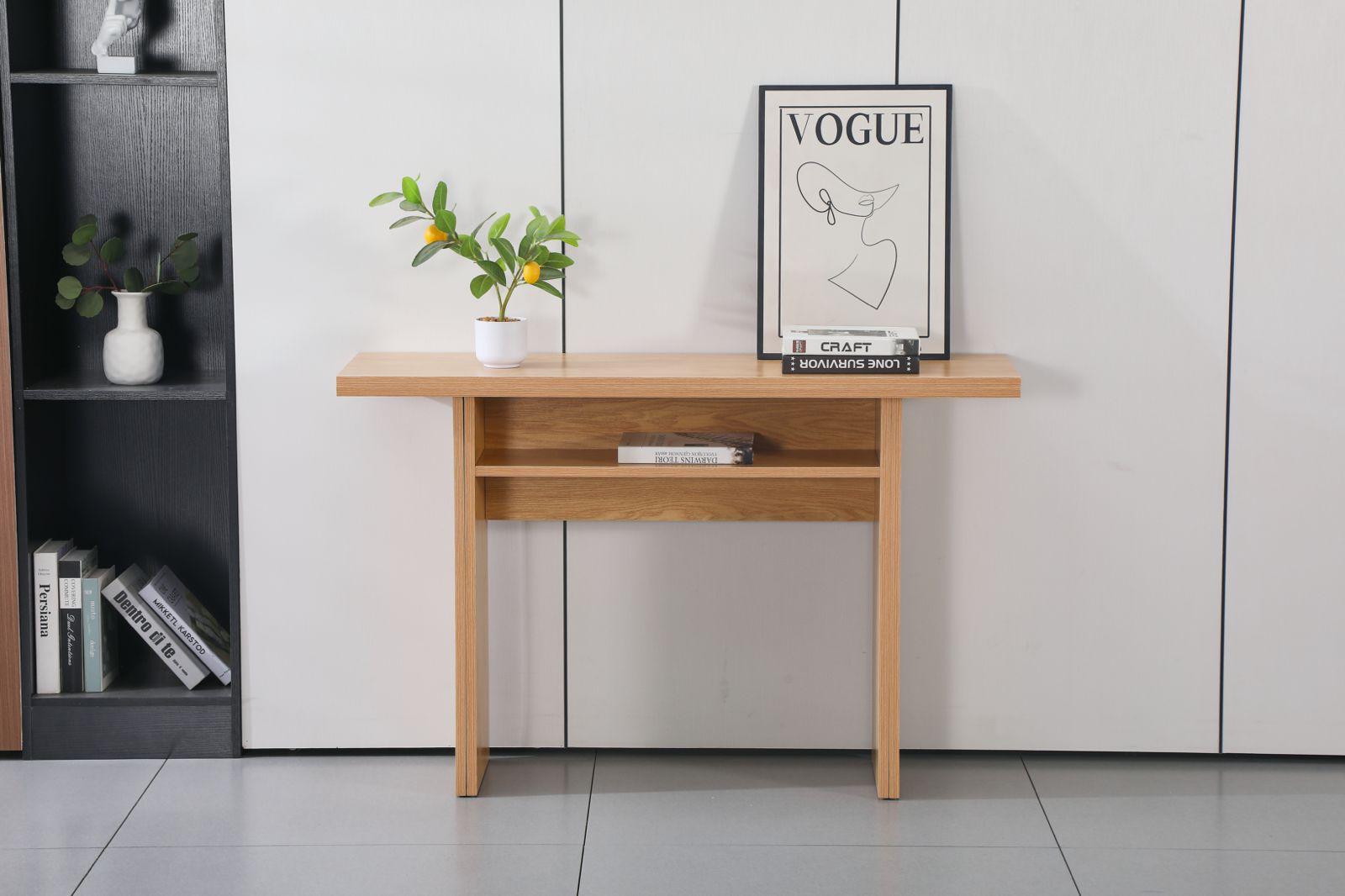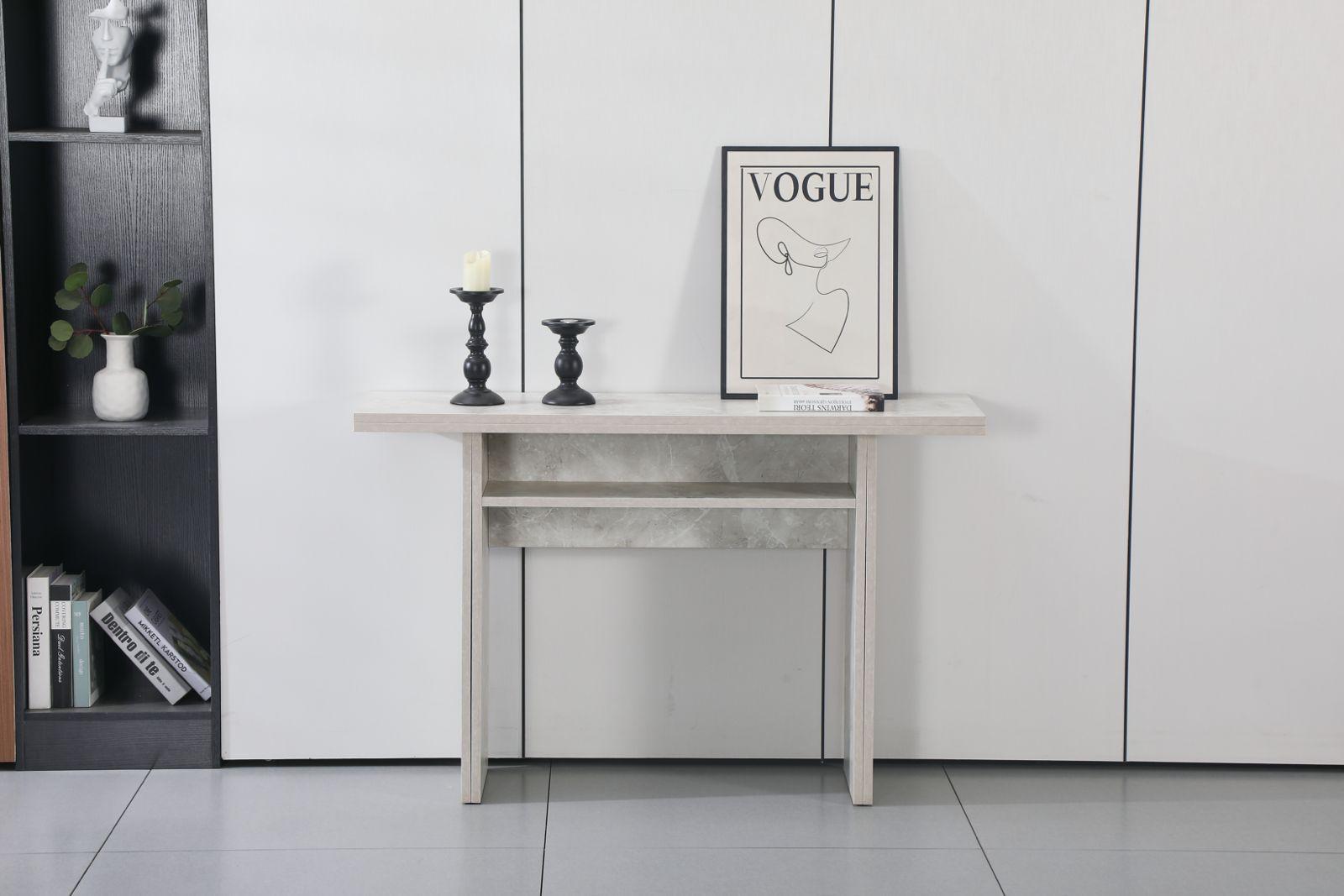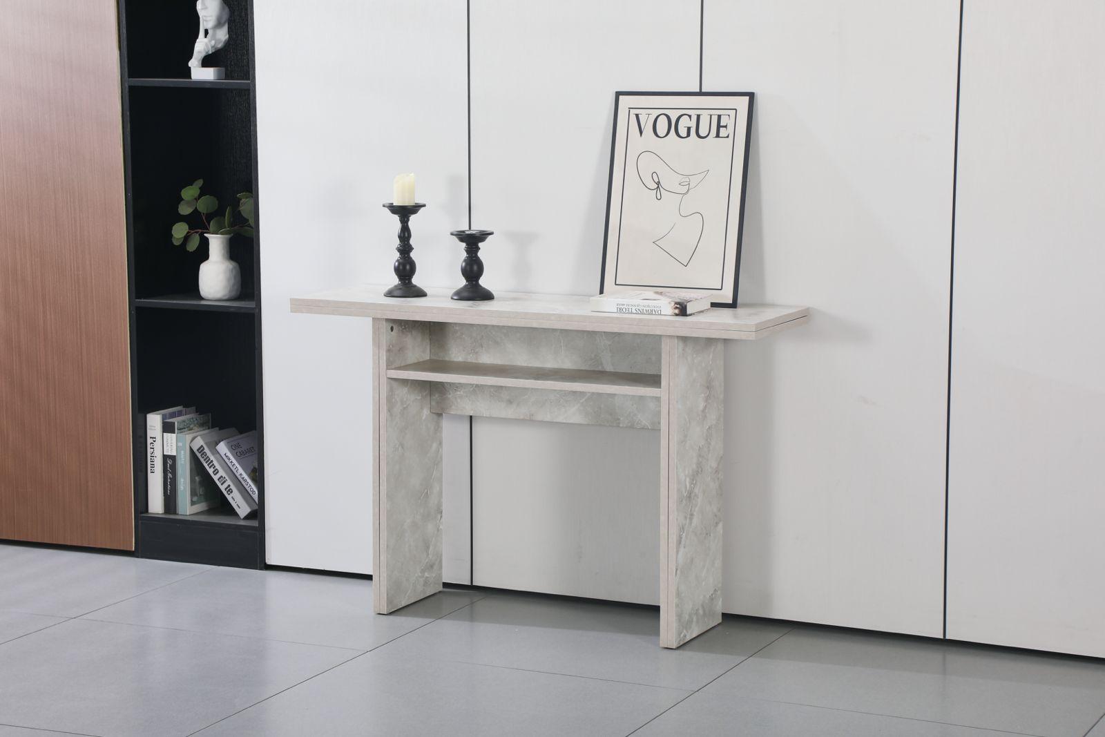 הקונסולה כוללת חלק עליון מתקפל, מנגנון פתיחה איכותי עם צירי מתכת, רגליים ניתנות להארכה, ותא אחסון פנימי שמקל על שמירת הסדר בבית. מגיעה בשלושה גוונים לבחירה – אפור מודרני, דמוי שיש יוקרתי, או עץ טבעי חמים – כך שתוכלו להתאים אותה בצורה מושלמת לעיצוב החלל שלכם.