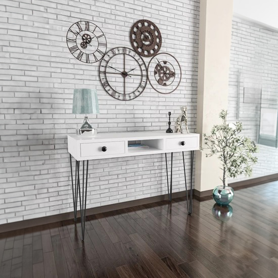 שידת כניסה בעיצוב מעודן עם רגלי סיכה עשויות מתכת עמידה במיוחד ומדף עשוי עץ איכותי בעל שתי מגירות לאחסון.