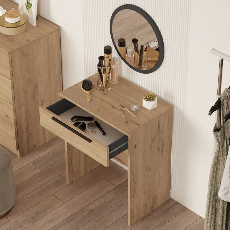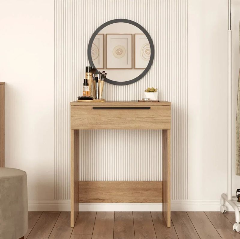 שולחן איפור מעוצב בגוון עץ עם מראה אפורה – שילוב של פרקטיות ואלגנטיות