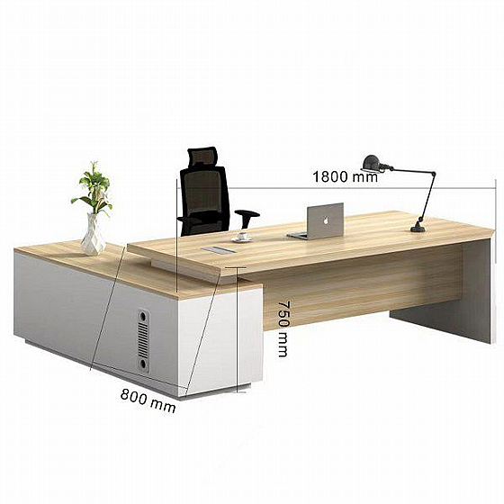 שולחן מנהלים מרשים בגוון עץ אלון בשילוב לבן, בעיצוב חכם למקסום מרחב העבודה.
