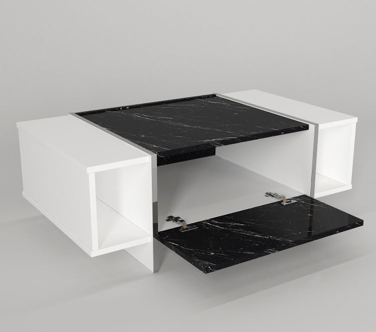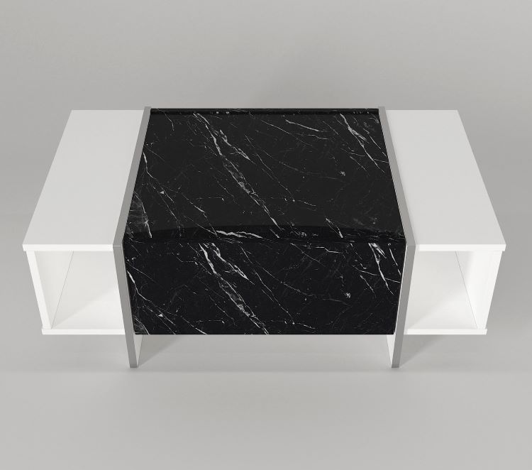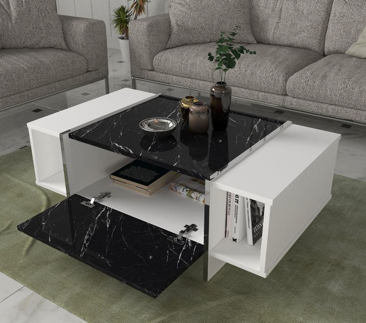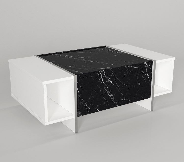 שולחן סלון מעוצב ואלגנטי בגוון לבן עם שילוב של משטח שיש שחור, המעניק לחלל מראה יוקרתי ומודרני.