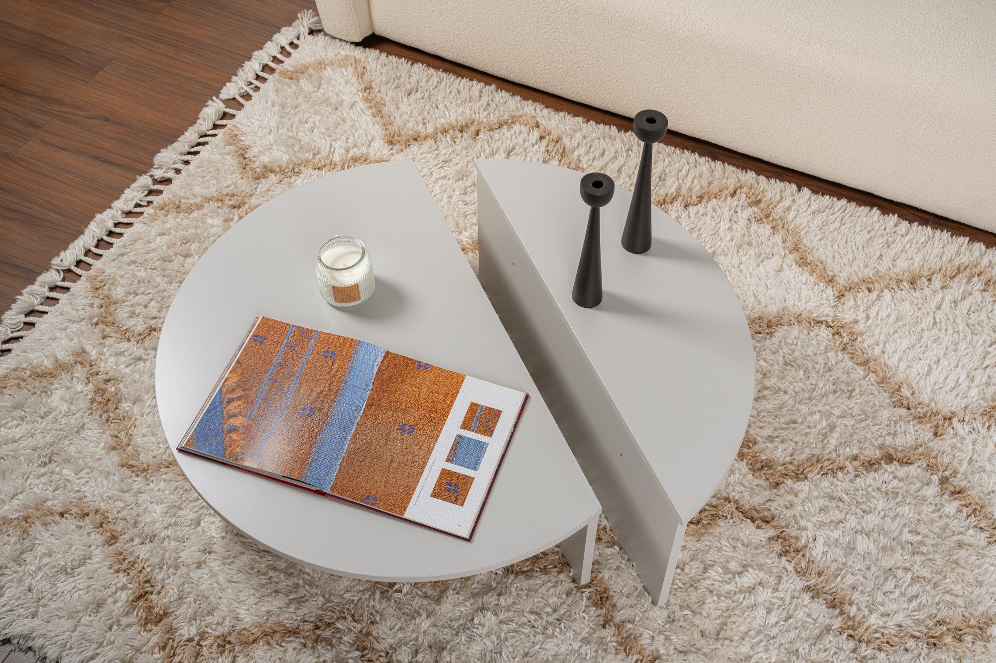 שולחן סלון עגול בצבע אפור בהיר, המעניק לחלל הבית תחושת רוגע, חמימות וסטייל אלגנטי.