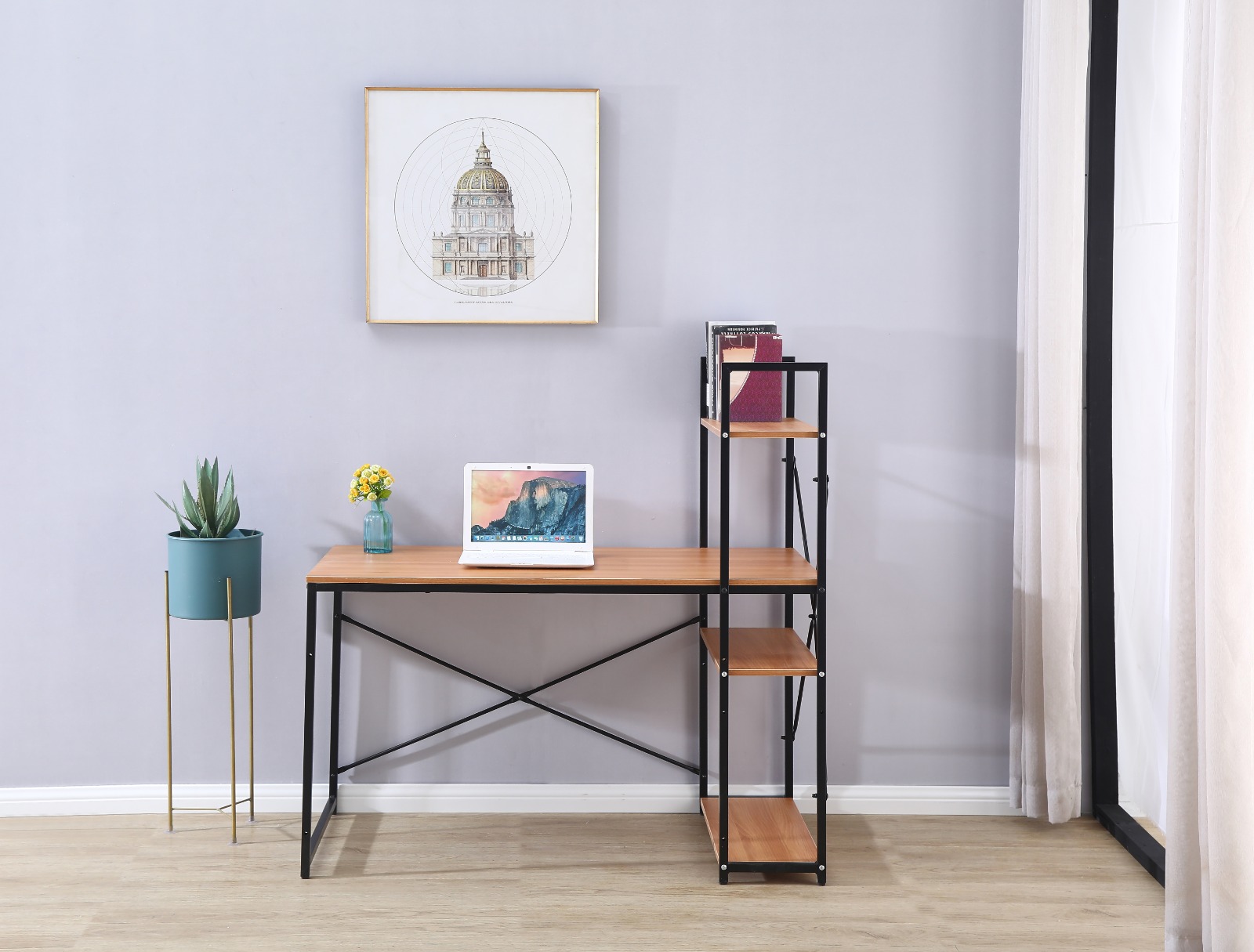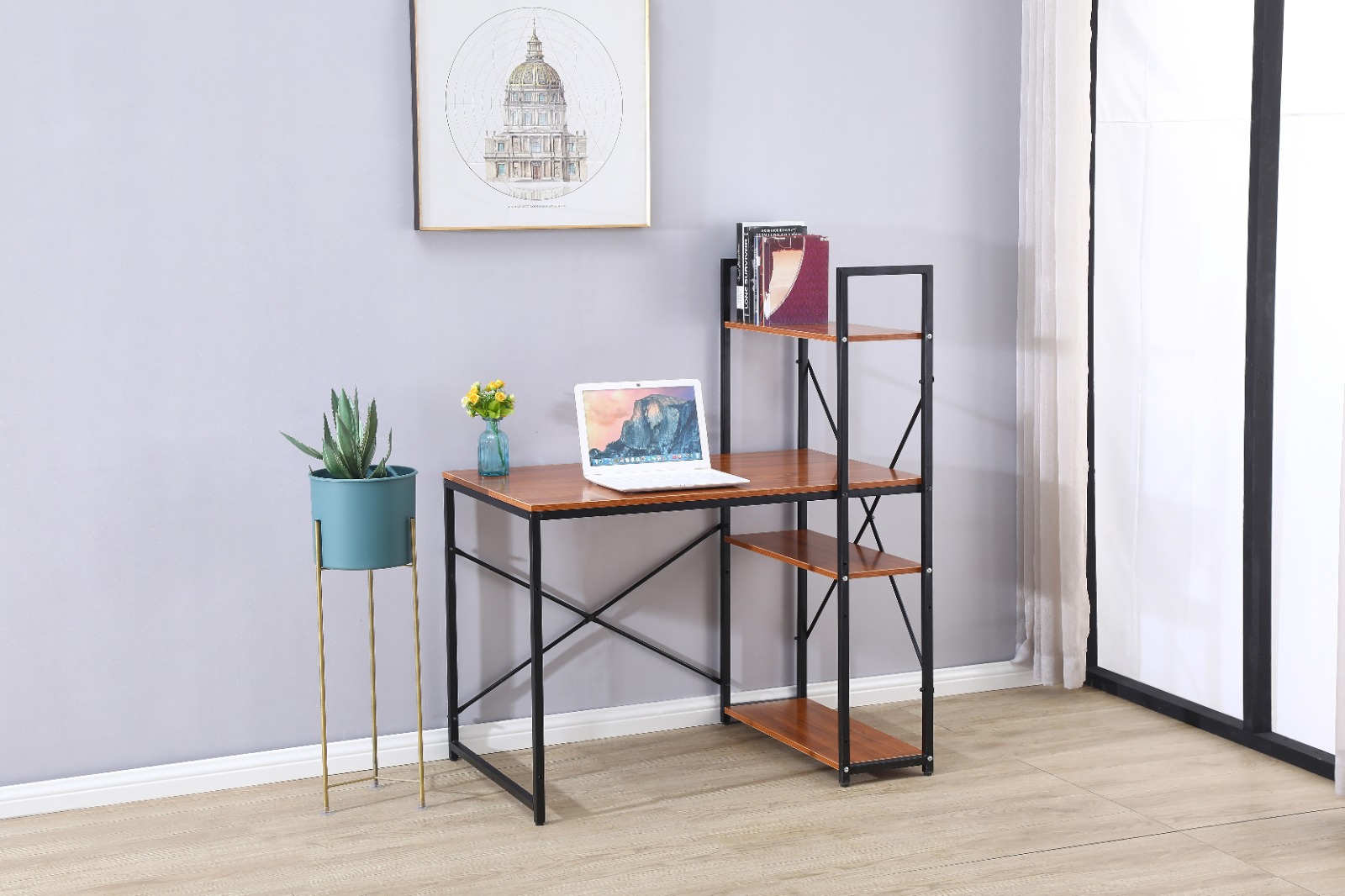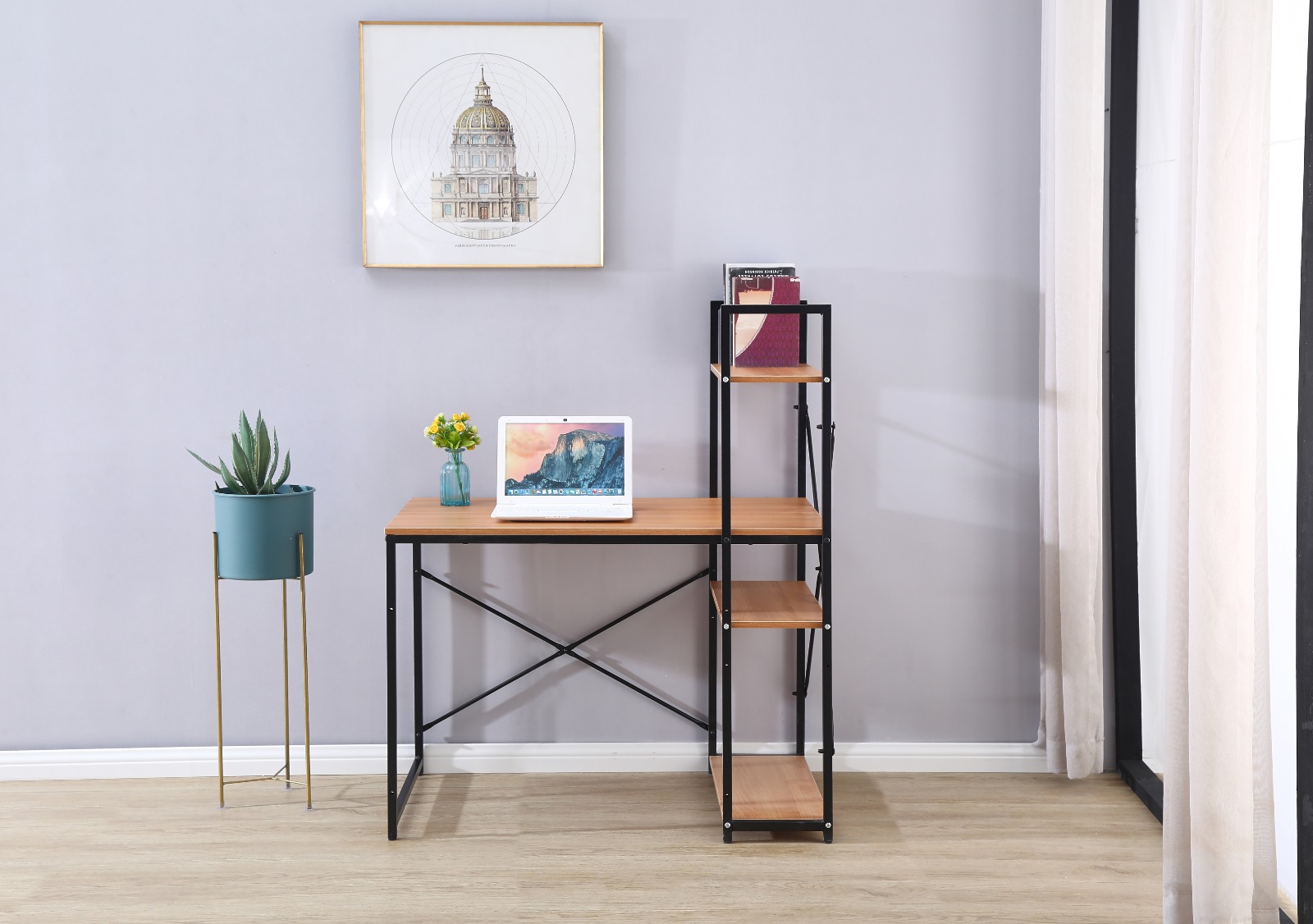 שולחן מחשב מעוצב המתאים למחשב נייד או מחשב נייח בעיצוב מודרני ומינימליסטי לנוחות עבודה בין אם מדובר בבית ובין אם מדובר במשרד, שילוב הספרייה לשולחן עוזר באחסון קל ונוח של ספרים או קלסרים לצד השולחן.