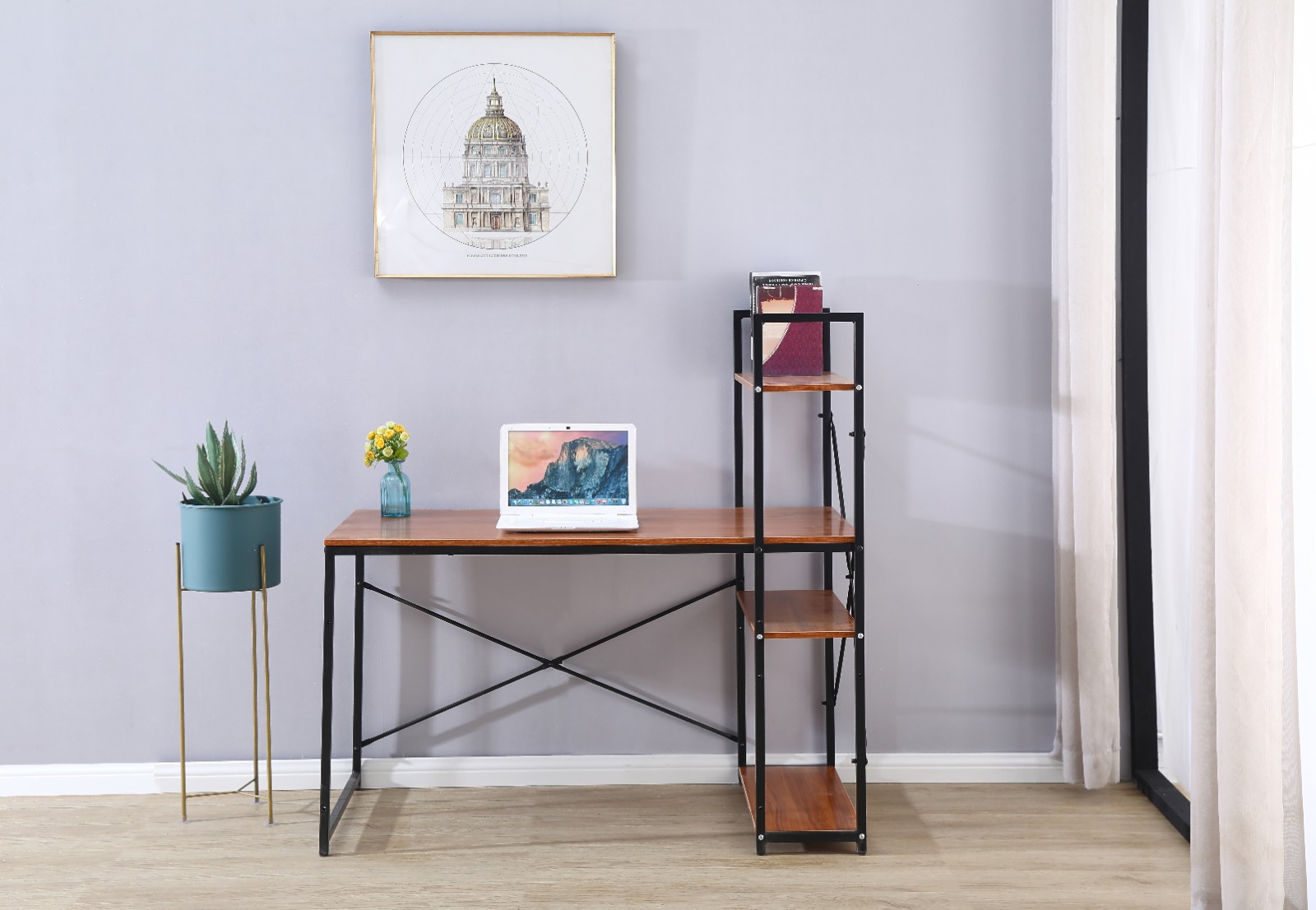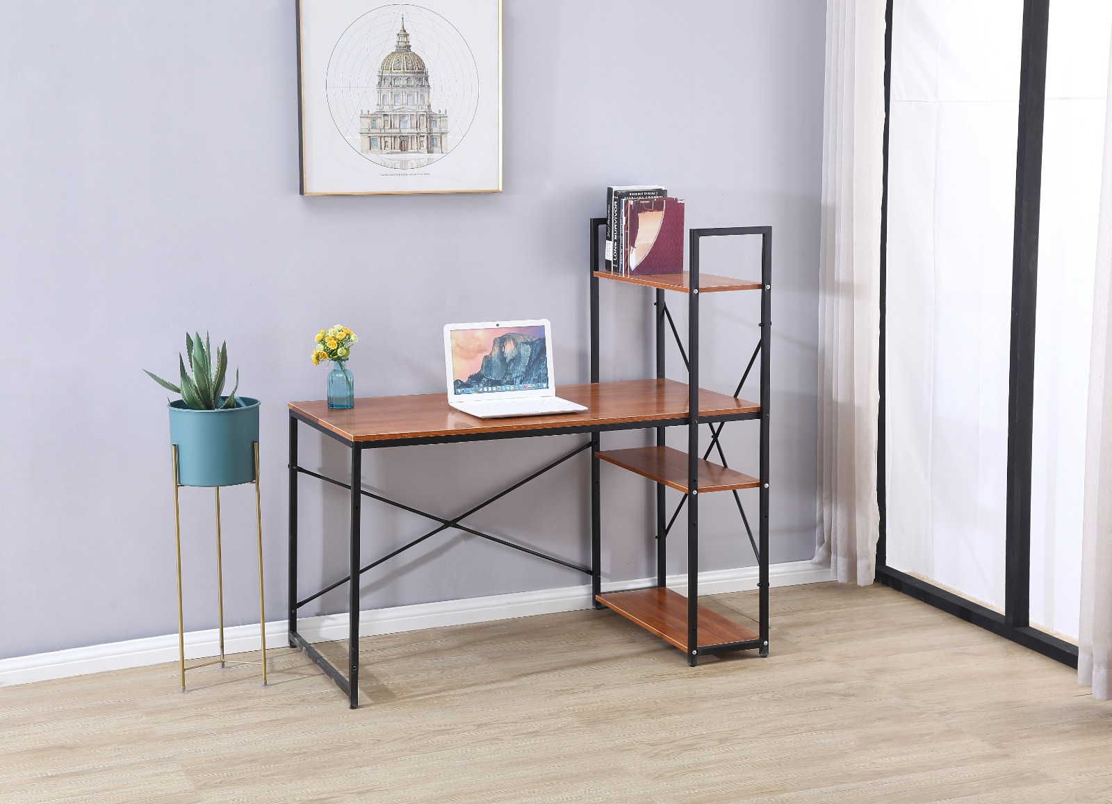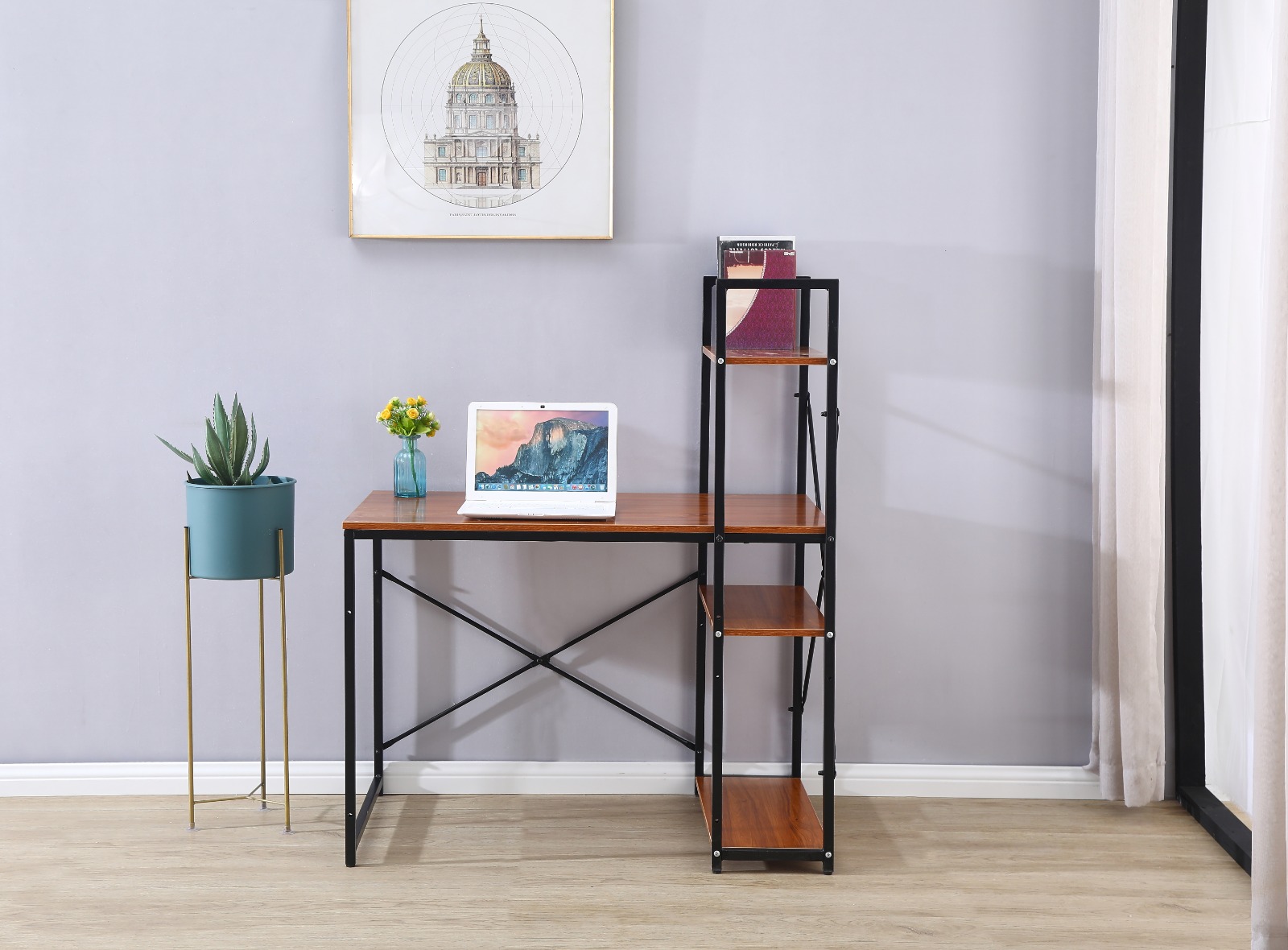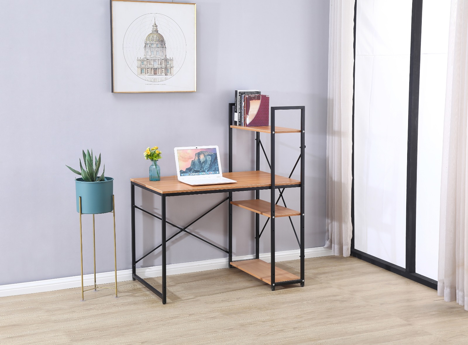 שולחן מחשב מעוצב המתאים למחשב נייד או מחשב נייח בעיצוב מודרני ומינימליסטי לנוחות עבודה בין אם מדובר בבית ובין אם מדובר במשרד, שילוב הספרייה לשולחן עוזר באחסון קל ונוח של ספרים או קלסרים לצד השולחן.