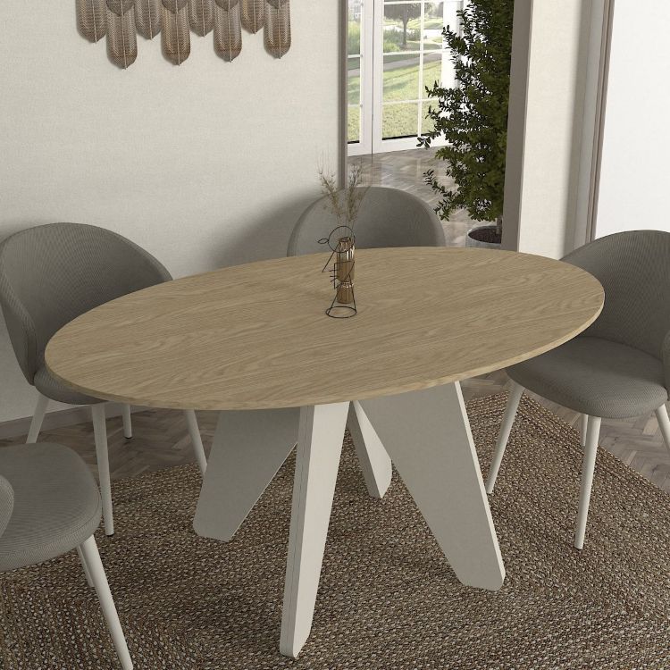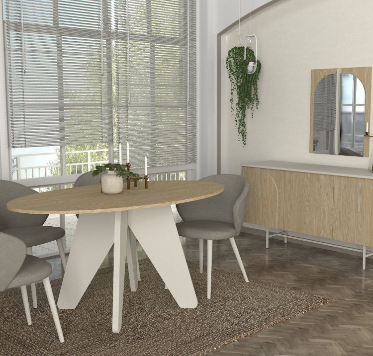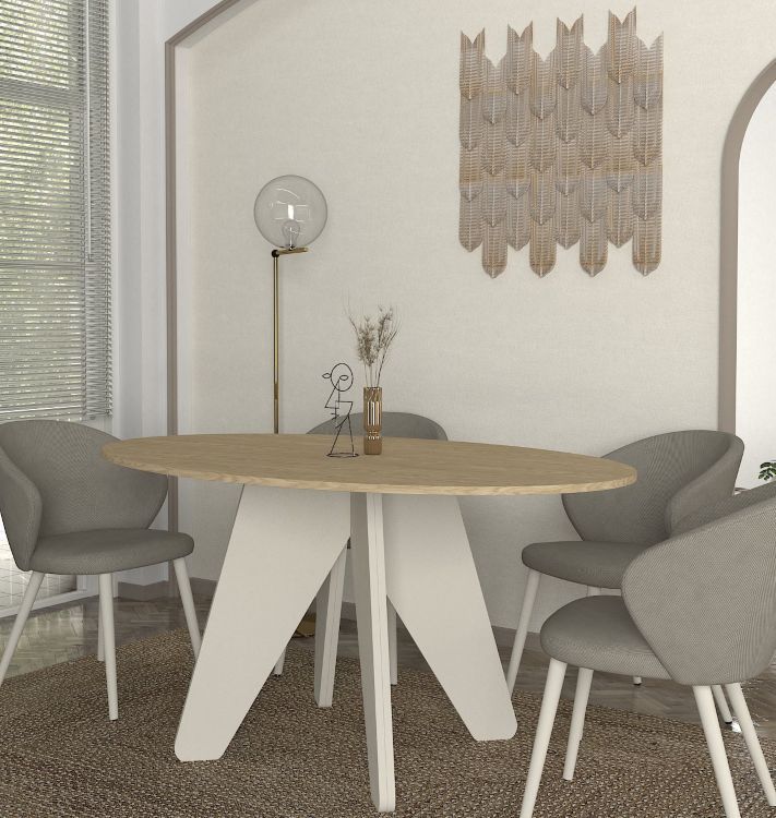 שולחן פינת האוכל דגם מדיסון מסדרת “Valoria” מבית Twins Design מציע שילוב מושלם בין פונקציונליות ועיצוב מודרני עכשווי. השולחן, שרוחבו 150 ס”מ, מעוצב עם משטח אובלי בגוון אלון, המעניק לחלל מראה יוקרתי וחם. הבסיס הגיאומטרי בצבע לבן-קרם משתלב באופן מושלם עם צורתו האובלית של המשטח, ויוצר קו עיצוב נקי וייחודי. השולחן הוא פתרון פונקציונלי ומשטח אידיאלי לאירוח של בני משפחה וחברים._x000D_