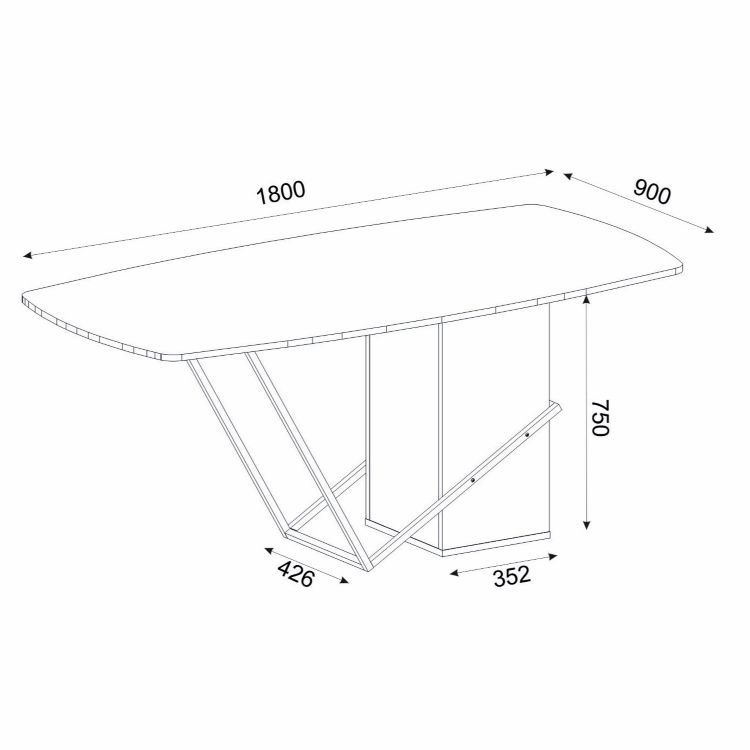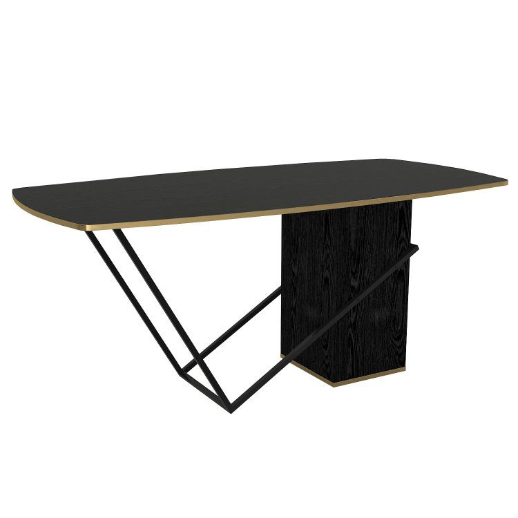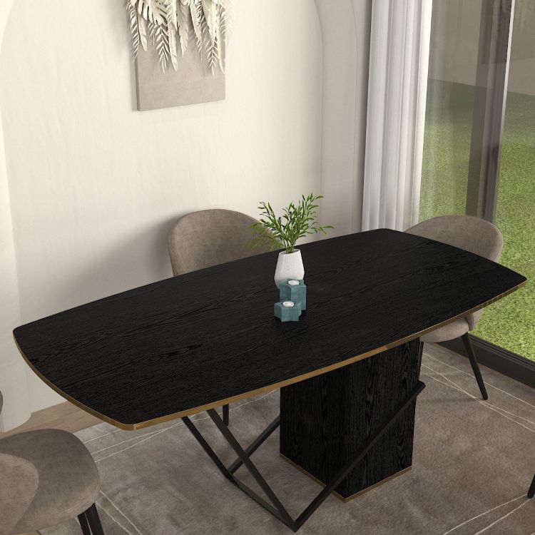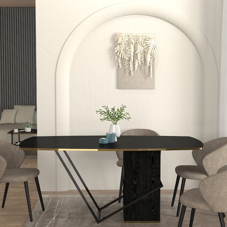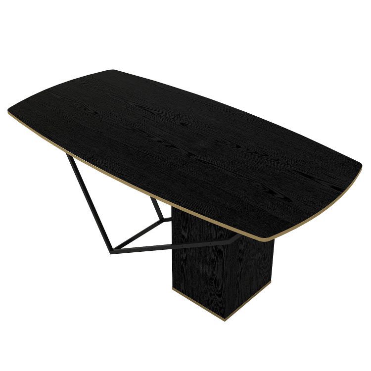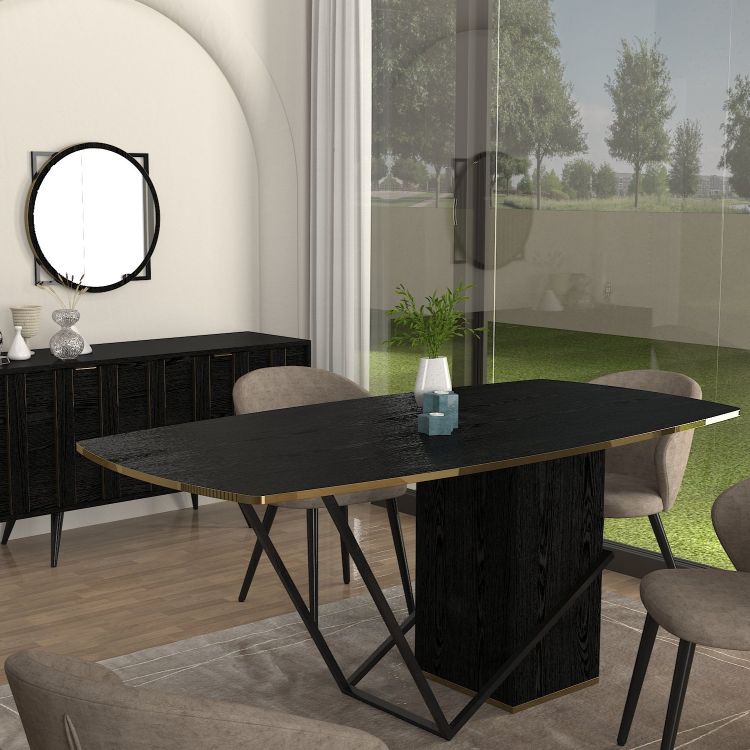 שולחן פינת האוכל ‘פיילוס’ מסדרת Obsidian מבית Twins Design הוא פריט אירוח מעוצב ומרשים, המשלב אסתטיקה מודרנית עם קווים גיאומטריים נועזים. השולחן, שרוחבו 180 ס”מ, מתאפיין בשילוב של גימור שחור-מבריק בעל טקסטורת עץ עדינה, עם רגלי מתכת מוזהבות ויציבות. הבסיס המעוצב בצורות חדות ומתוחכמות, יחד עם הפלטה המלבנית בעלת הפינות המעוגלות, מעניקים לשולחן מראה דרמטי וייחודי, מושלם לאירוח של בני משפחה וחברים._x000D_