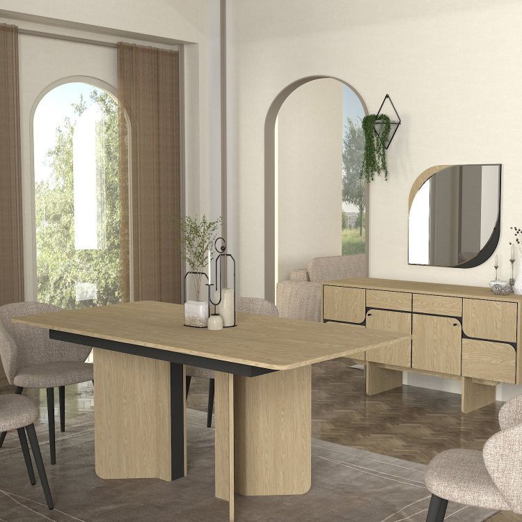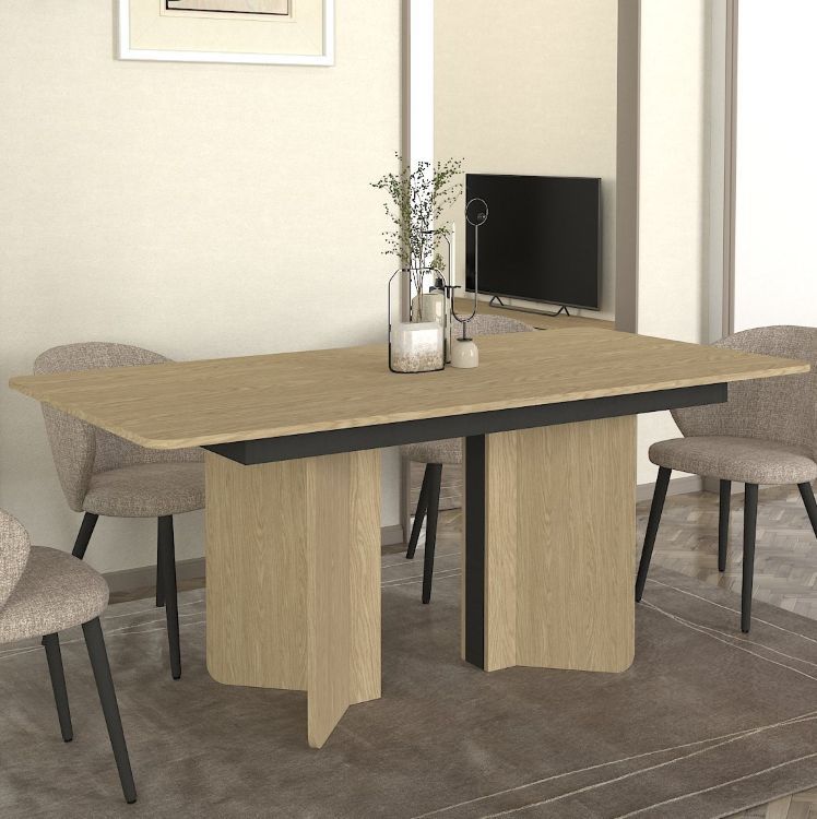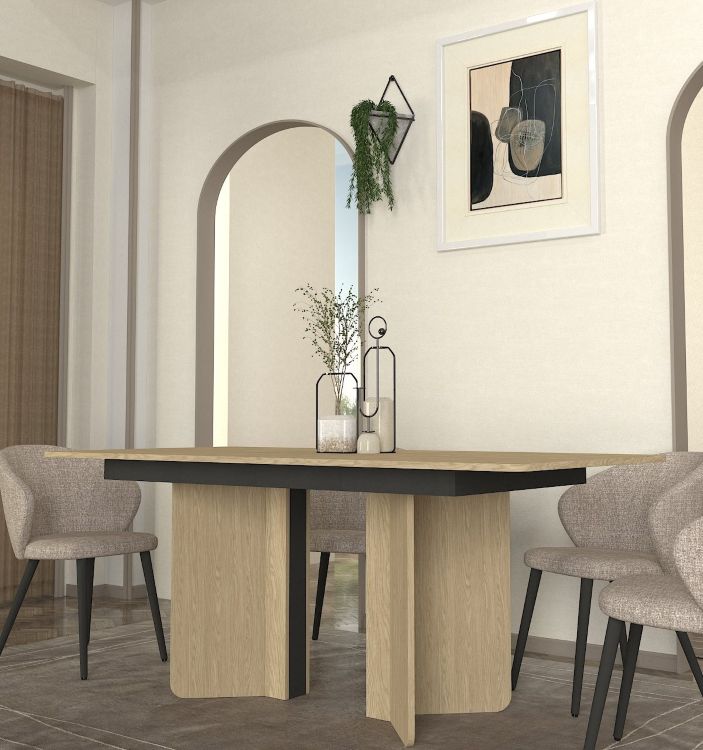 שולחן פינת האוכל דגם “ארגו” מסדרת Eclipse מבית Twins Design הוא פתרון אירוח מעוצב ומרשים, המשלב אסתטיקה מודרנית עם קווים אורגניים רכים. השולחן, שרוחבו 180 ס”מ, מתאפיין בשילוב של גימור עץ אלון בהיר עם נגיעות אפור כהה בבסיס, היוצר ניגוד הרמוני ויוקרתי. הבסיס המעוצב בצורות מעוגלות, יחד עם הפלטה המלבנית בעלת הפינות המעודנות, מעניקים לשולחן מראה מתוחכם וייחודי. השולחן מספק מקום נוח ורחב לאירוח של בני משפחה וחברים._x000D_