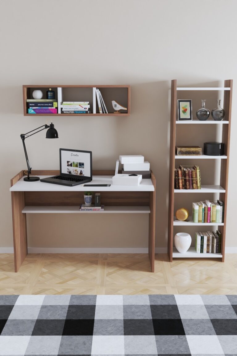 עיצוב פרקטי ומודרני, המספק מקום מסודר למחשב, ספרים, מחברות וציוד לימודי נוסף.